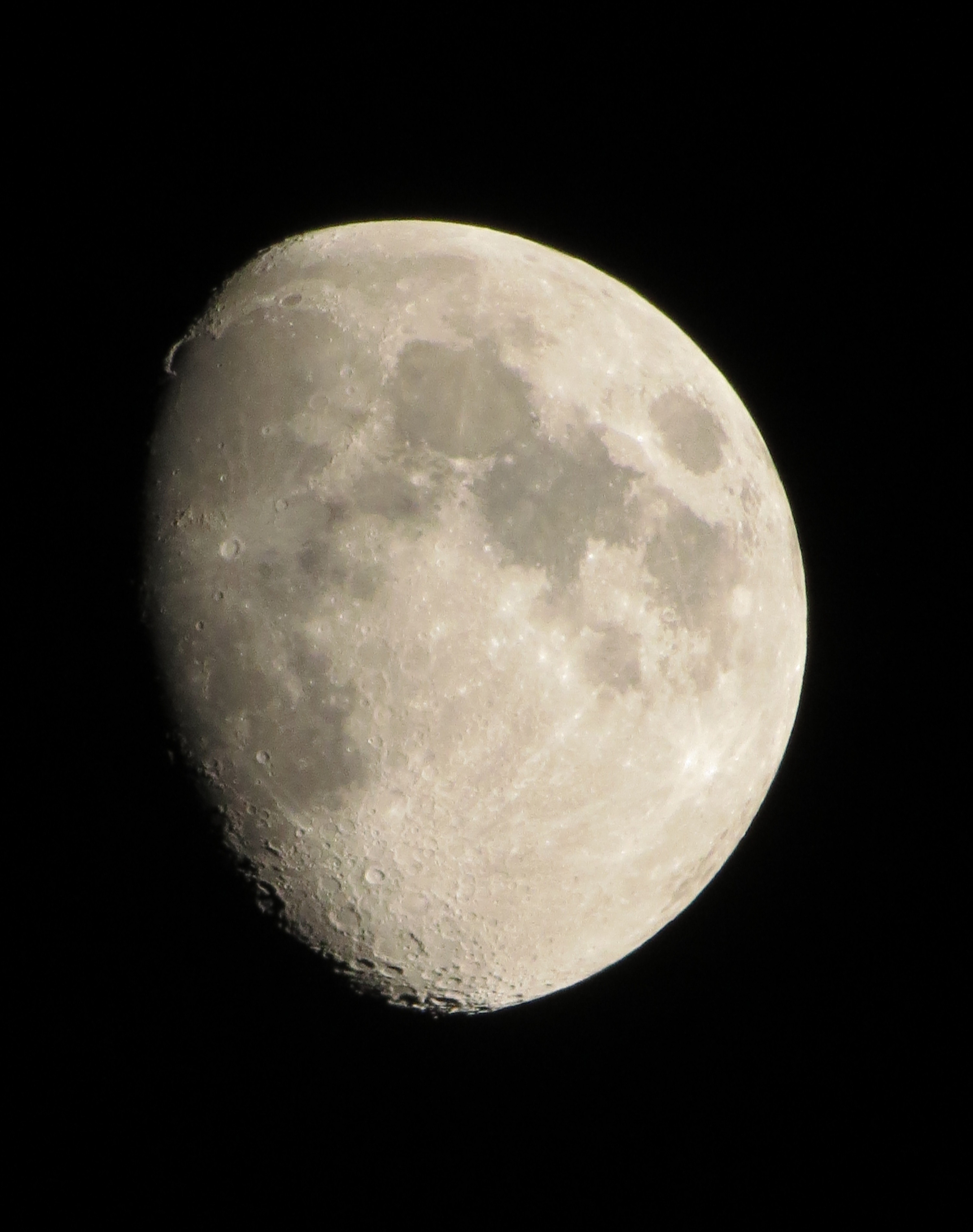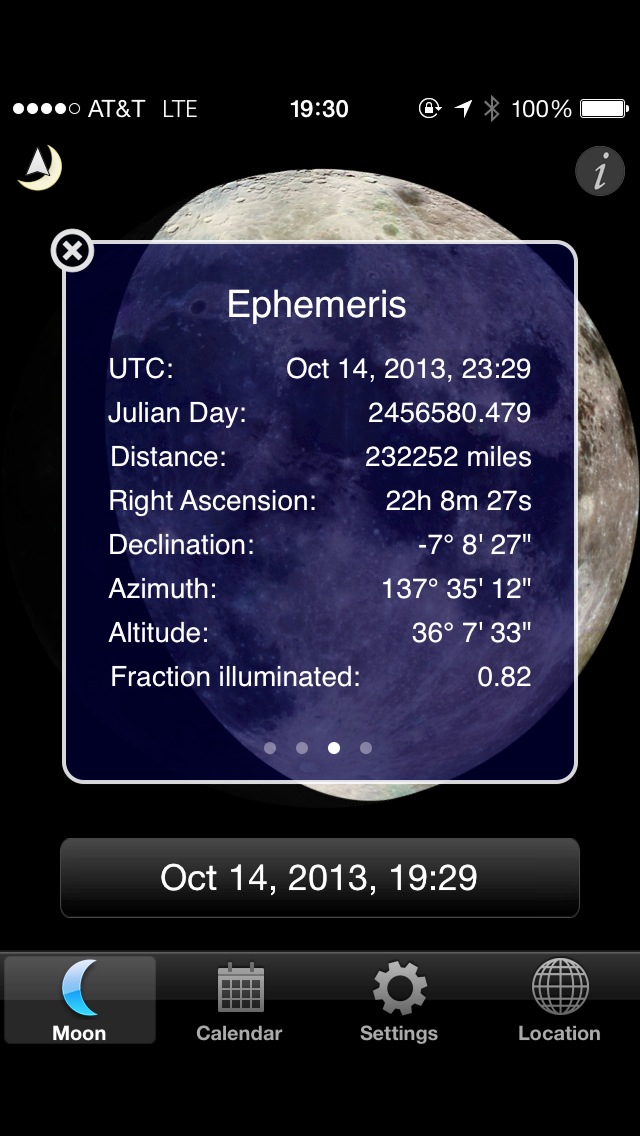 I also played around with moon pictures a little more. The moon was rising very, very clear on Monday, October 14. I got a handful of pictures of it at 5:30 or so, still over an hour-and-a-half before sunset. Then I took a couple more around 7:30 and a final set close to 9:00. I use an app called MoonPhase that shows some moon info. So I took a screenshot each time I took a photograph. The screen shot is of the “ephemeris” data from MoonPhase.