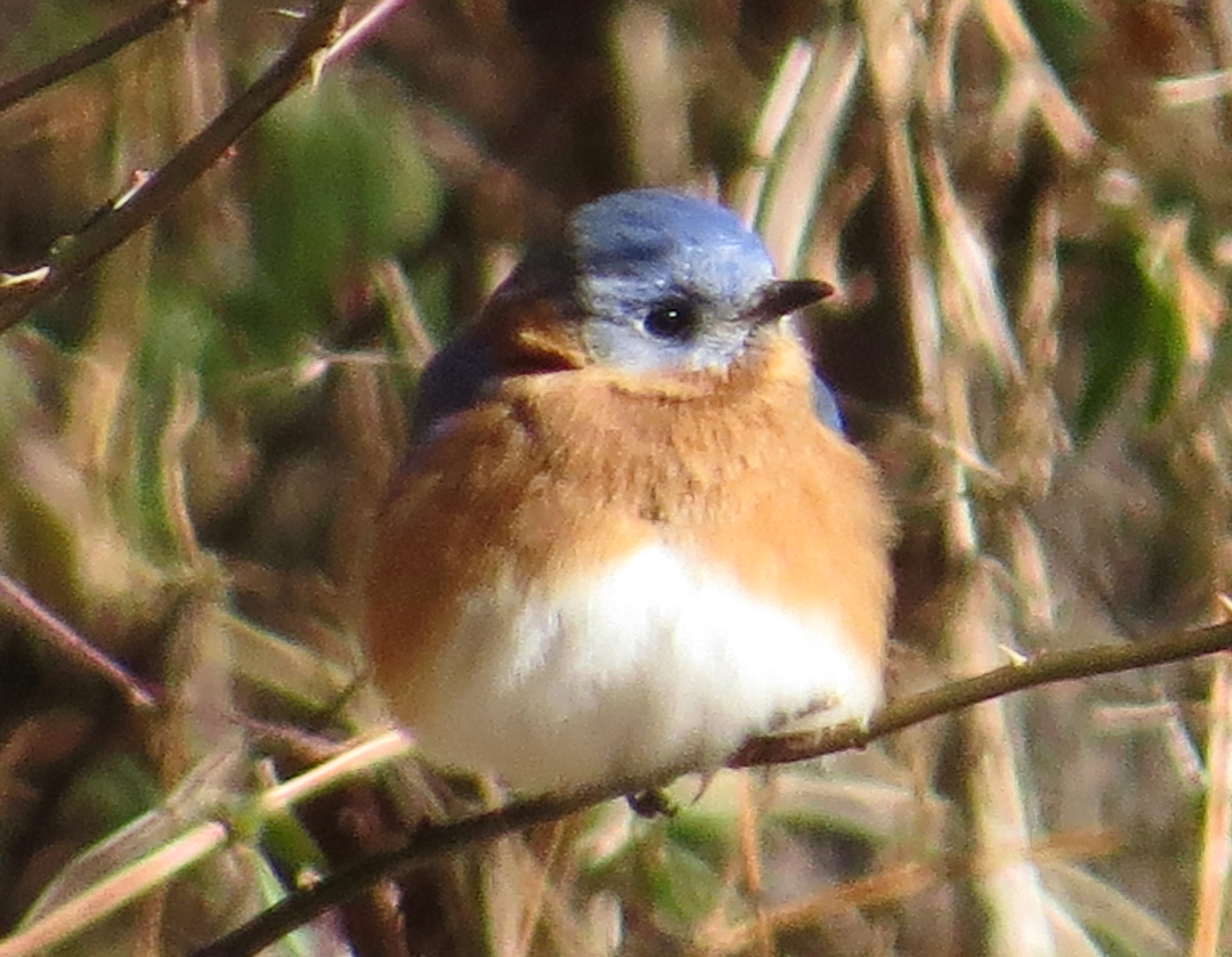 The first ten years I hiked at Pony Pasture I saw zero bluebirds. Now thanks to the efforts of Ralph and Nathan and the James River Park Service and many others, there are dozens. It’s just amazing. This one was puffed up on a branch: