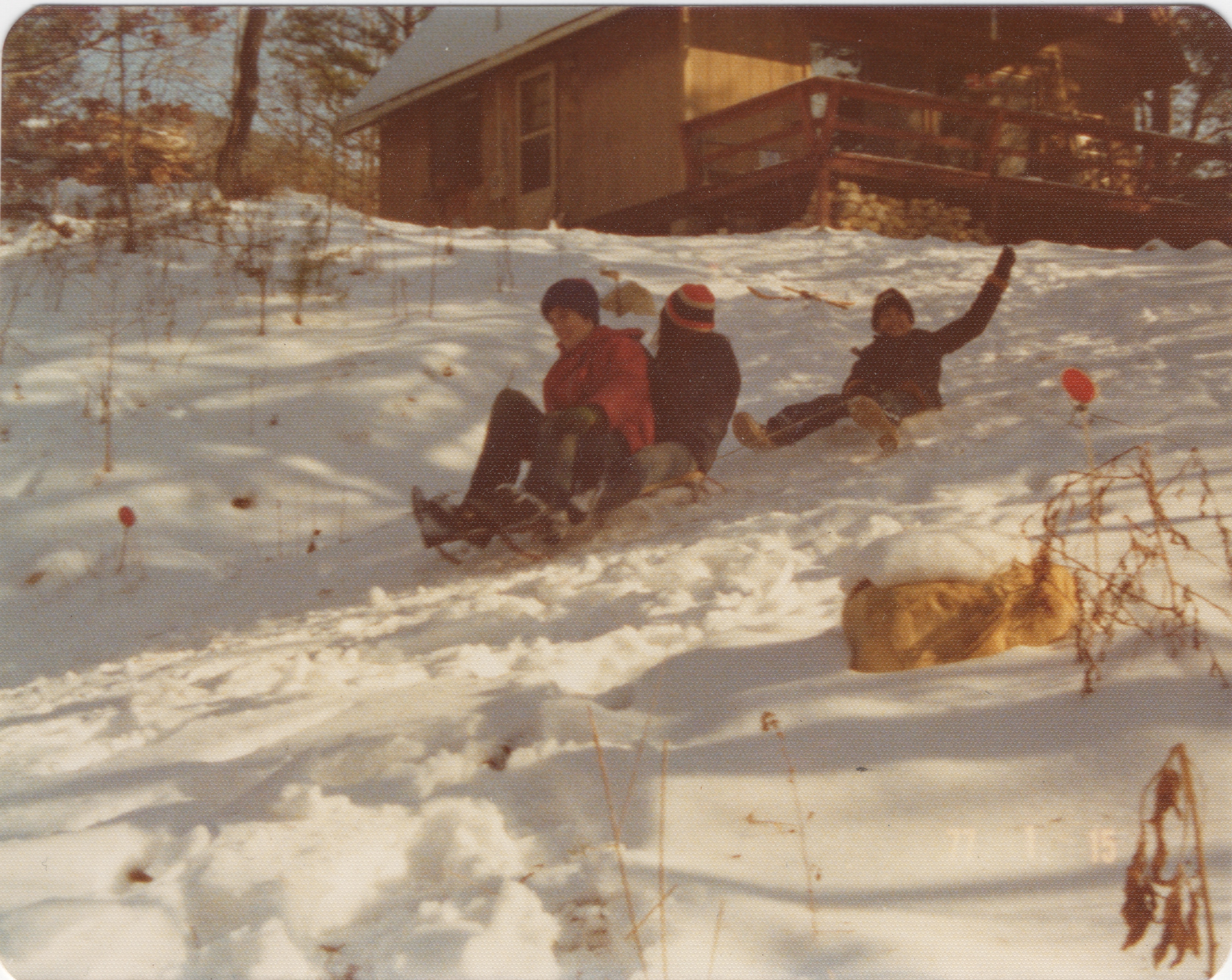 That’s the cabin in the background, we’re sledding down our steep gravel driveway. I think that’s me on the front, then Sheila, then Kevin. So this is maybe 1975 or 1976? Or 1977? In that era.