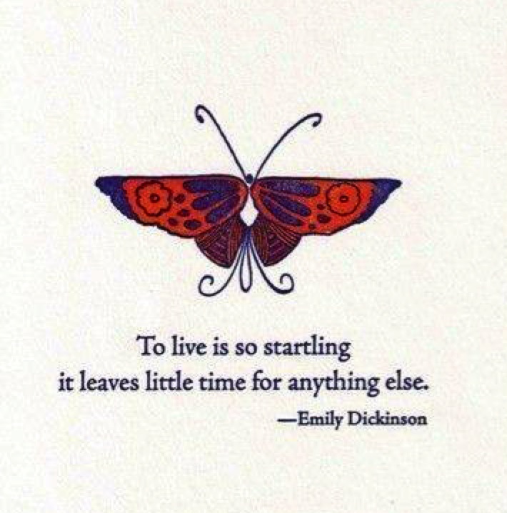 Fortunately Turner began eating mulberries and reminded me how startling it is to live. I’d nearly forgotten. At nearly the same time, this quote appeared on – talk about startling – the Emily Dickinson facebook page. I mean, nobody saw that one coming. In the late 1970’s when I was reading “Hope” is the thing with feathers and Pain — has an Element of Blank. An Emily Dickinson facebook page. But here’s a fun image/quote: