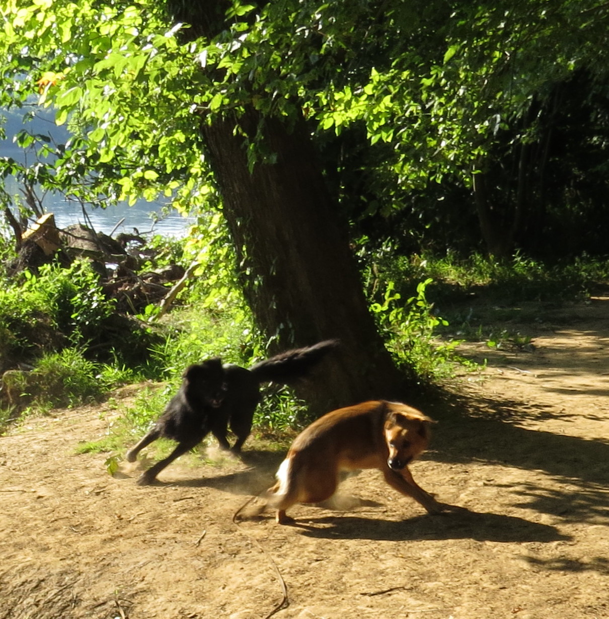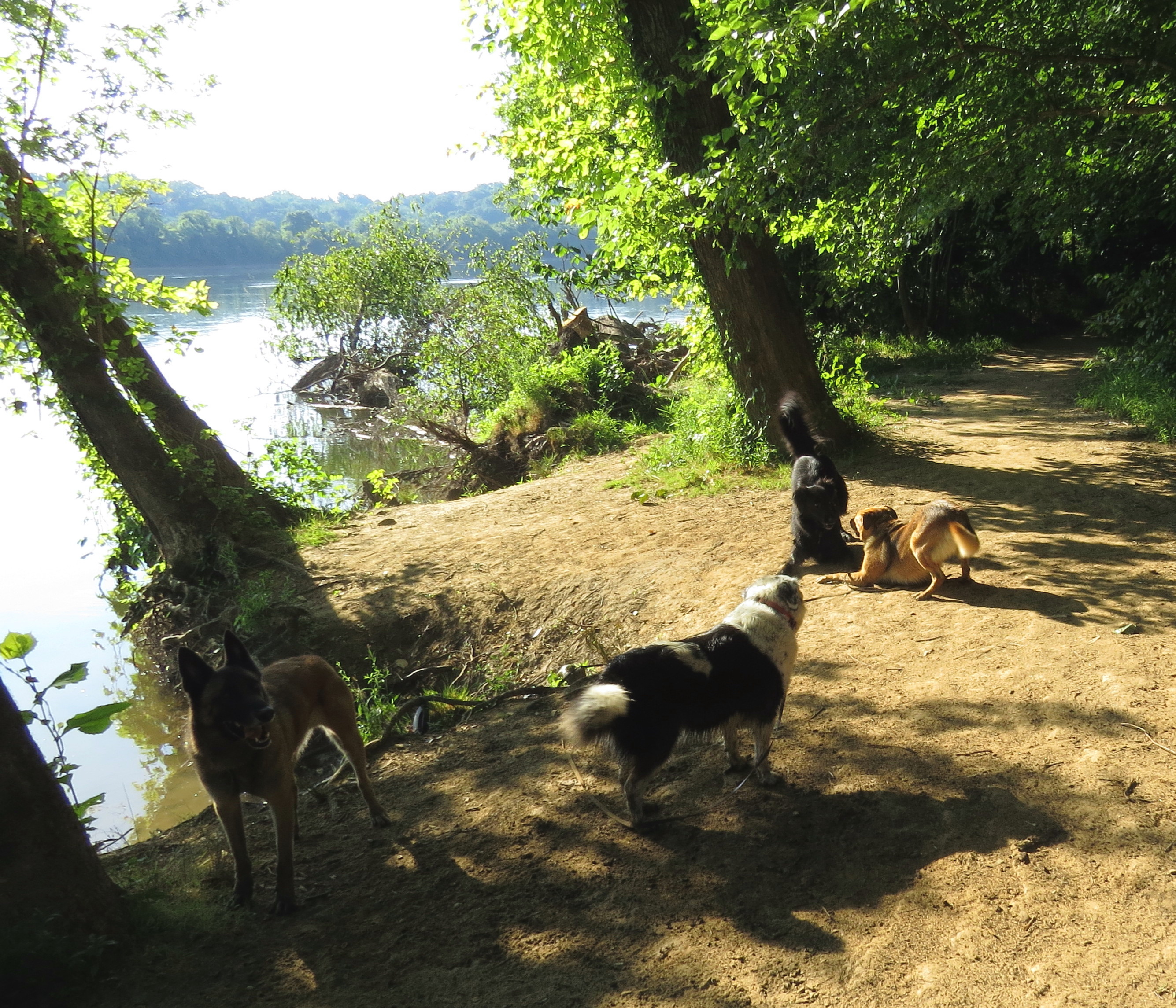 Mackey and Turner and I had the good fortune to spend time this week with Lola and Luna. If you click on this link for last week’s post: Pillow fight!, you’ll see the four of them relaxing calmly on the trail at the end of a long hike. Flash forward to this morning’s hike, and playtime at the edge of the river. Turner is in the shadow in the lower left. He likes fun as much as – really more than – the next dog. But he’s kind of a daddy’s boy and when things get noisy he stays close to me. Luna has her back to us and is watching the excitement. She’s a smart girl and she knows Mackey and Lola are well matched in age and temperament and demeanor. It’s easy for them to have fun together: