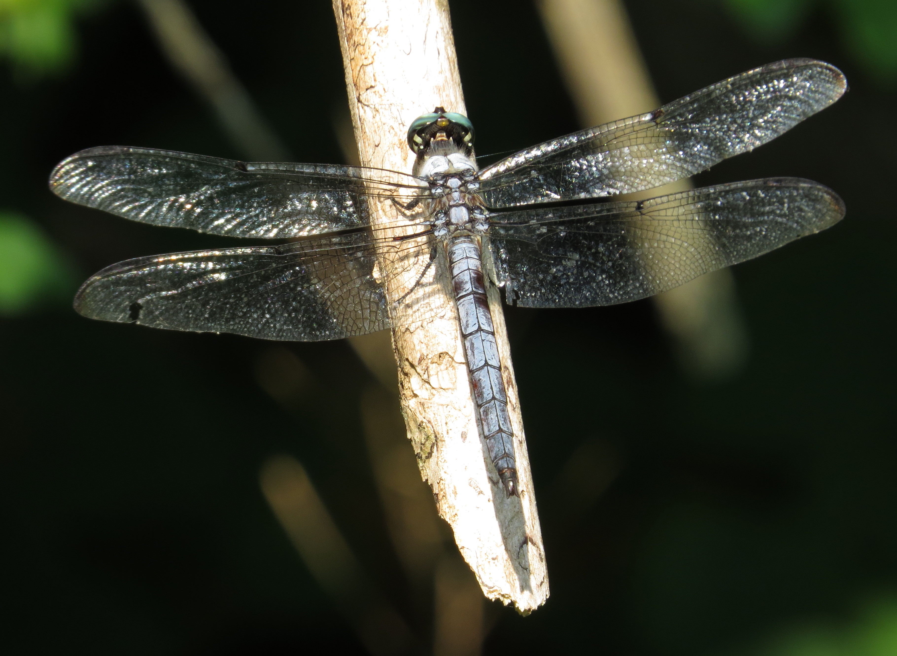 If you notice the light dusty/powdery covering on his back, that’s referred to as “pruinescence.” You can chase all over the internet (or you can take my word for it) but a precise definition of that word that a lexicographer would appreciate is difficult to find. Pruinescence you may have also noticed – if you think for a moment – on grape skins and on plums. Blueberries too I think. It reflects ultraviolet light which dragonflies and damselflies can see with their compound eyes. But pruinescence is the dragonfly equivalent of gray hair on humans – you don’t see it on youngsters.