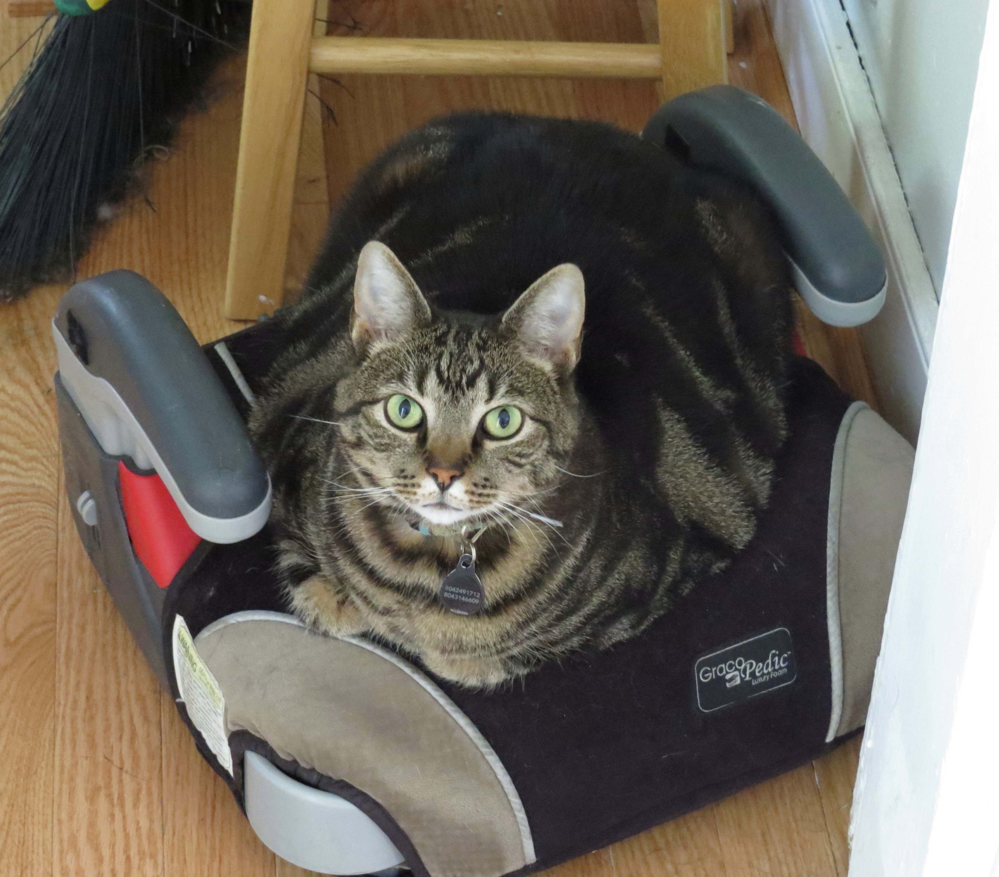 That is not a staged shot – he just likes to sit there. Speaking of other unstaged alternate uses for car seat situations, another one came up – still not making this up – the same day. Old friends were in from Oregon and we only had a brief visit while they passed through town. We were outside and it began sprinkling and one of their kids used a car seat – a car seat that looked remarkably similar to Gerald’s – as a rain hat. Same day. Totally didn’t see that coming. I regret that I was unable to photograph it.