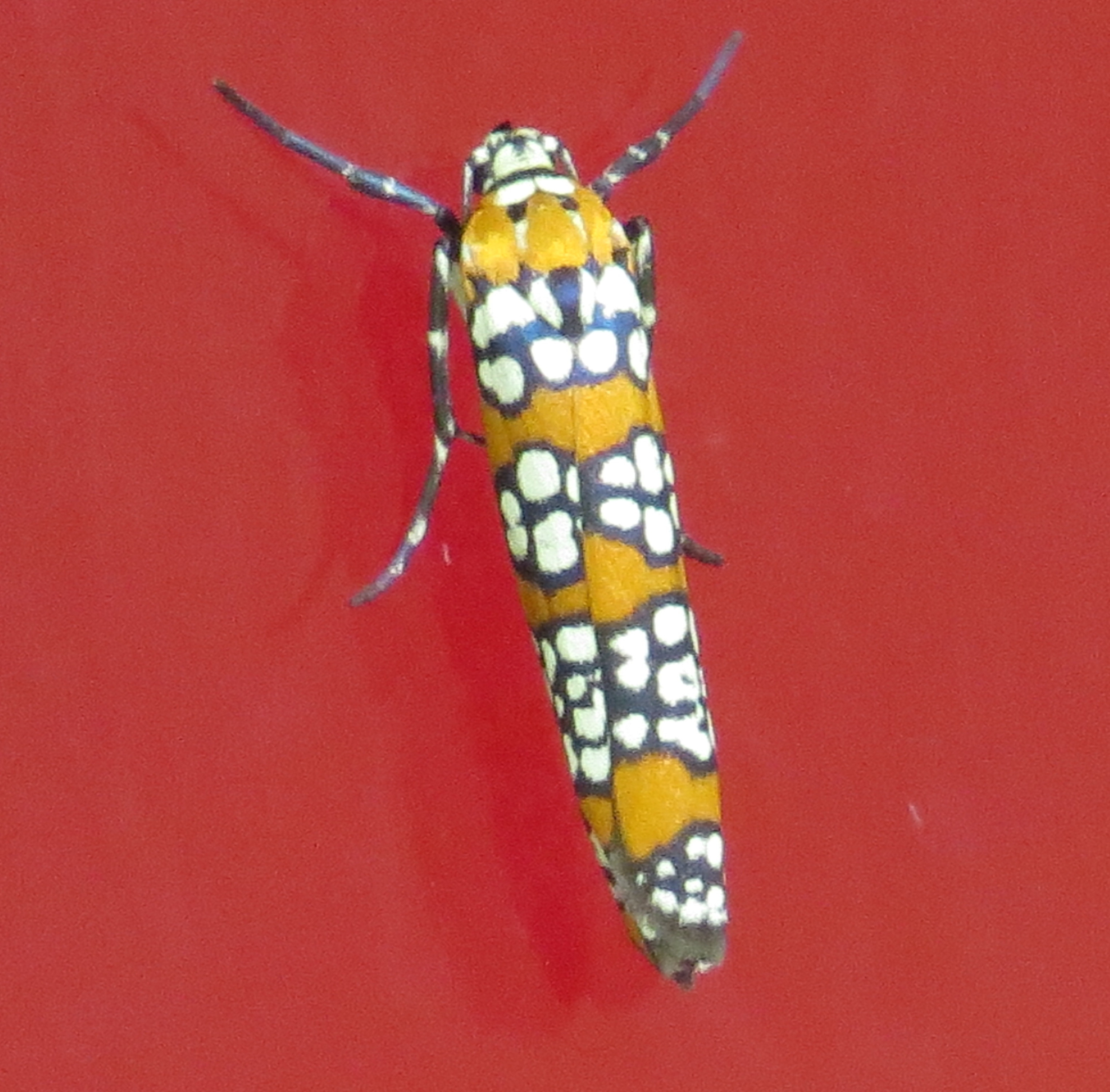 If you look through the first three or so years of this blog, you’ll see a bug picture or two, mostly butterflies, but not that many. For some reason in 2014 I just began looking at bugs and the more I look at them, the more I see. I was meeting Pat to go for a ride this afternoon and as I walked out the door I saw this beauty on my front door: