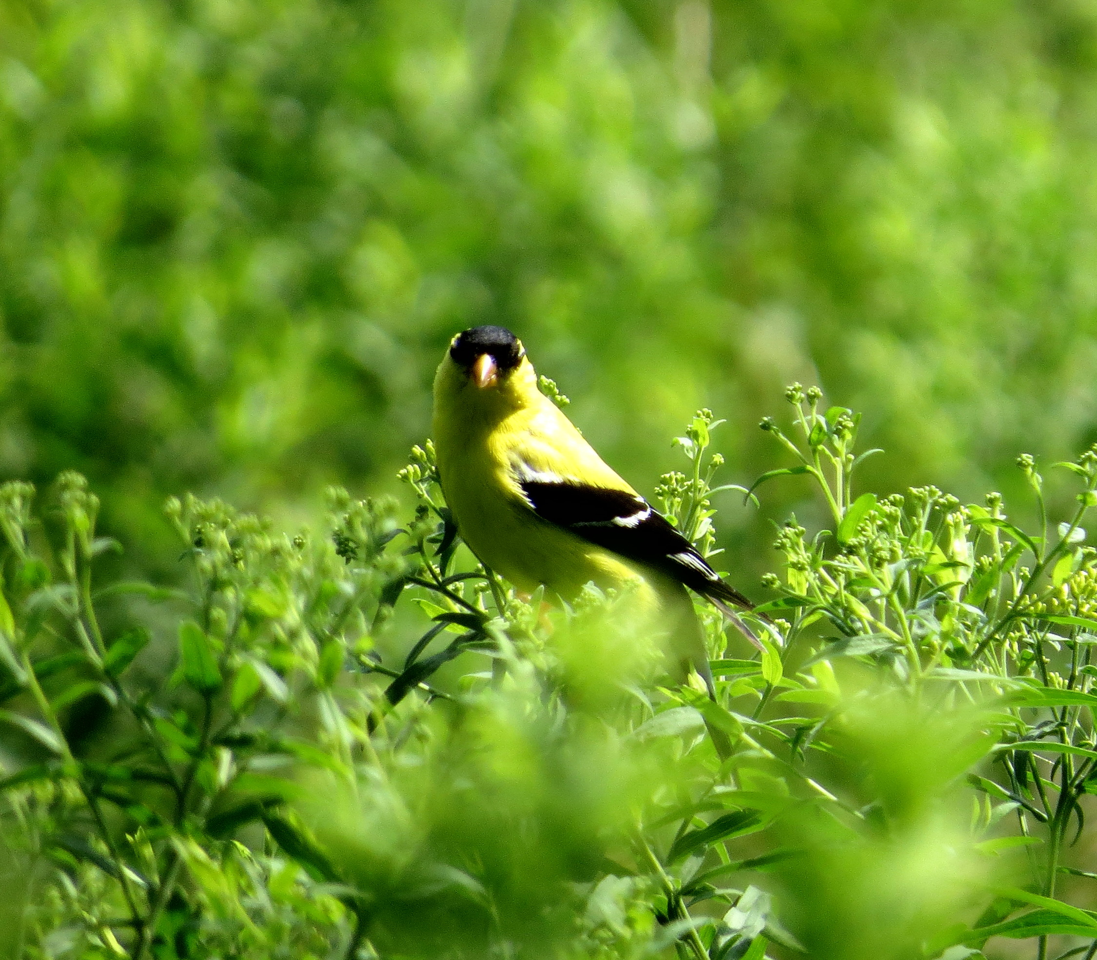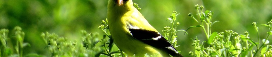 It hasn’t been all bugs this summer; just a lot. I managed to juggle three leashes long enough in the back field at Pony Pasture to catch this goldfinch glancing our way: