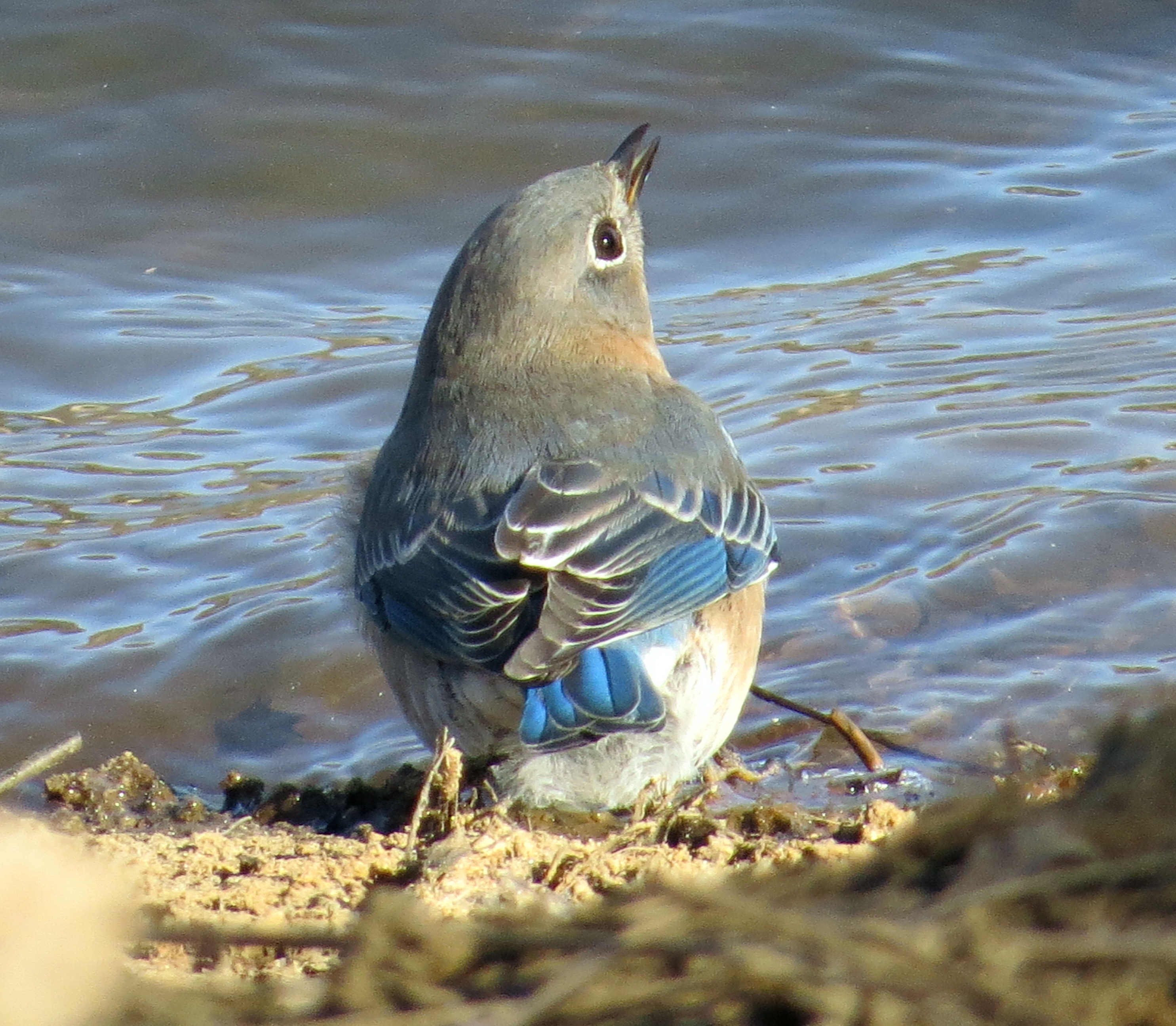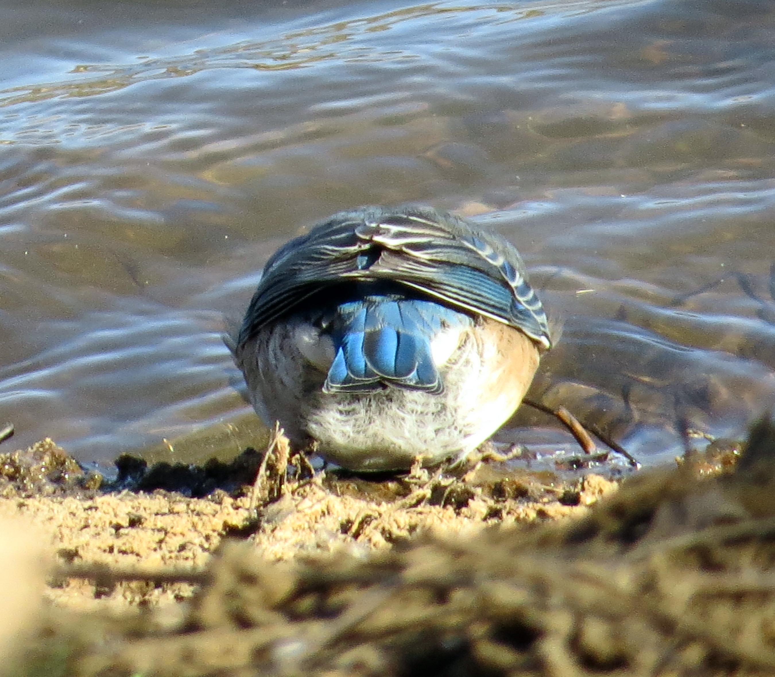 Stepping out of the car this morning at Pony Pasture, the trees and bushes were filled with bluebirds. I’ve never seen them near the parking lot. It is just amazing how many bluebirds are in Pony Pasture these days. Amazing and gratifying. I didn’t get any pictures this morning, but this one was on the river bank Thursday morning drinking like it was his own private bowl: