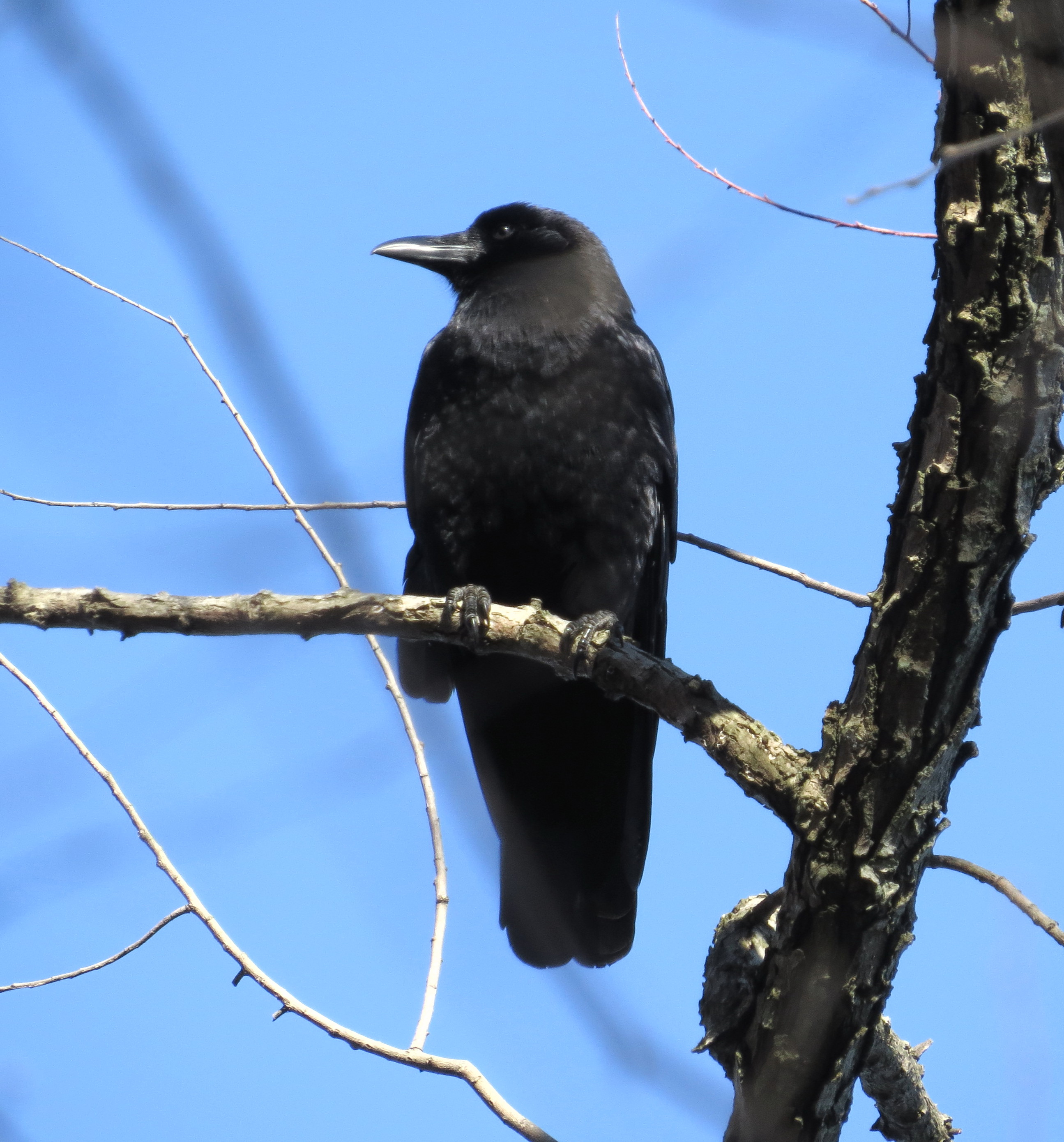 This morning (Sunday) at Pony Pasture a few crows stopped in a tree on the river’s edge. Believe it or not (see preceding paragraph) their official name is “American crow” (Corvus brachyrhynchos). Normally when I see crows at Pony Pasture it’s a mob of them harassing a hawk or an owl. This group was more staid: