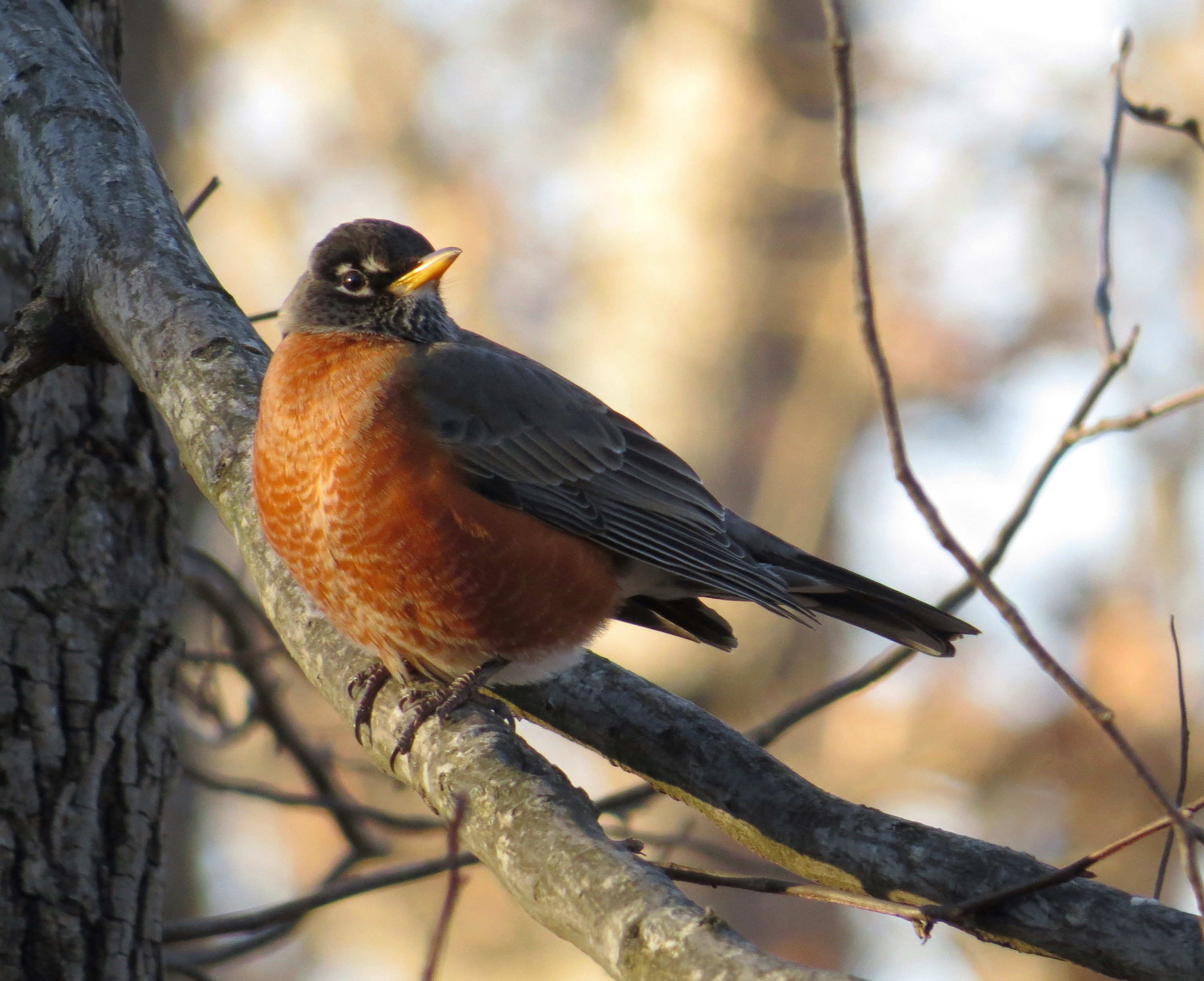 Here’s another picture from earlier this week – an American robin (Turdus migratorious). “American robins” are the ones you always see – that’s just their official name. There are also European robins but not here. American robins may be the most abundant bird in the world, although I’ve heard that about Red-winged blackbirds (Agelaius phoeniceus ) as well. Robin with chest puffed out to keep warm: