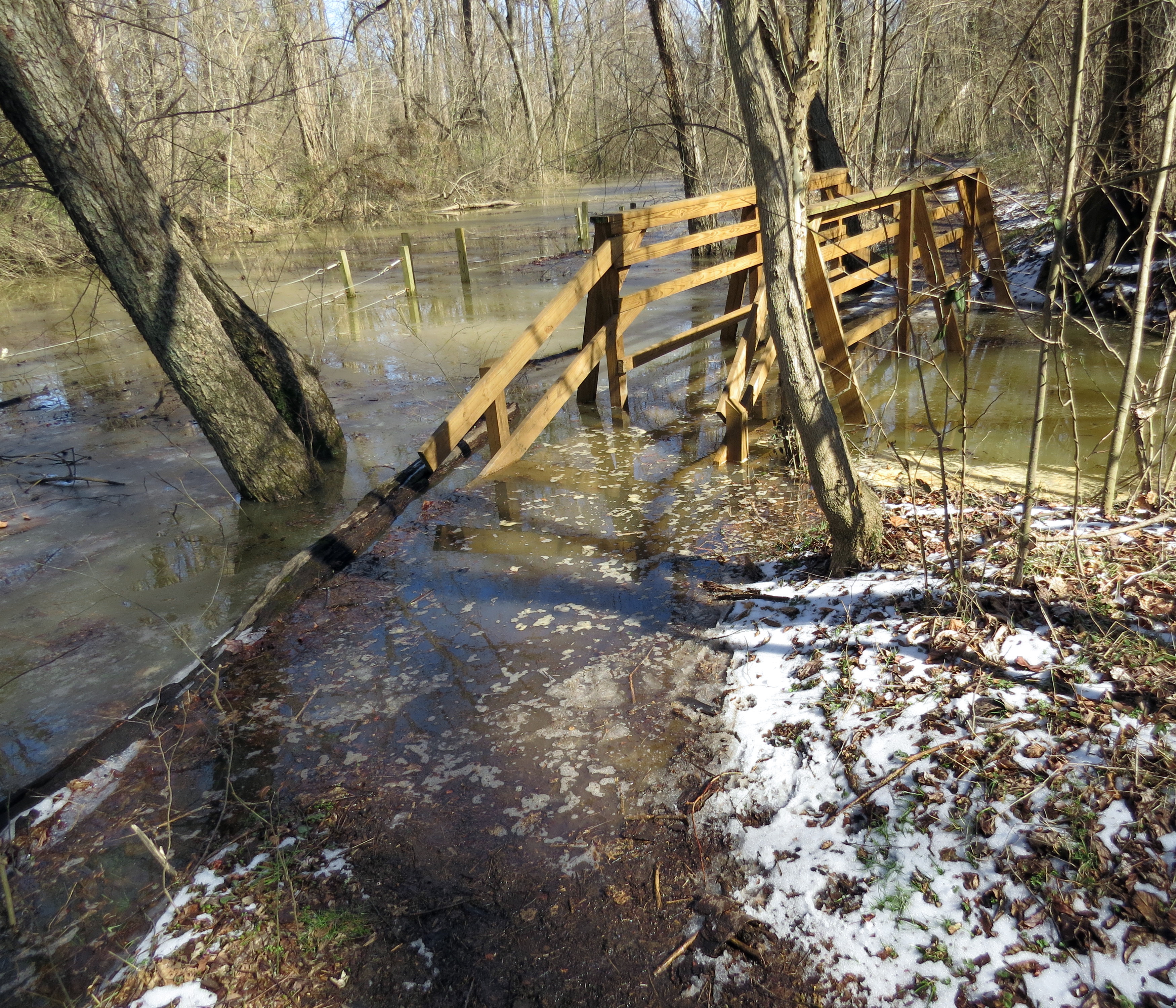 This is looking back at the bridge. If you’re a Pony Pasture hiker, you may be familiar with this area. And if you look to the left, you can see 4×4’s and wires sticking out of the water; those are handrails along a large pipe that is normally two or three feet above the surface of the water. Rather than a foot below it: