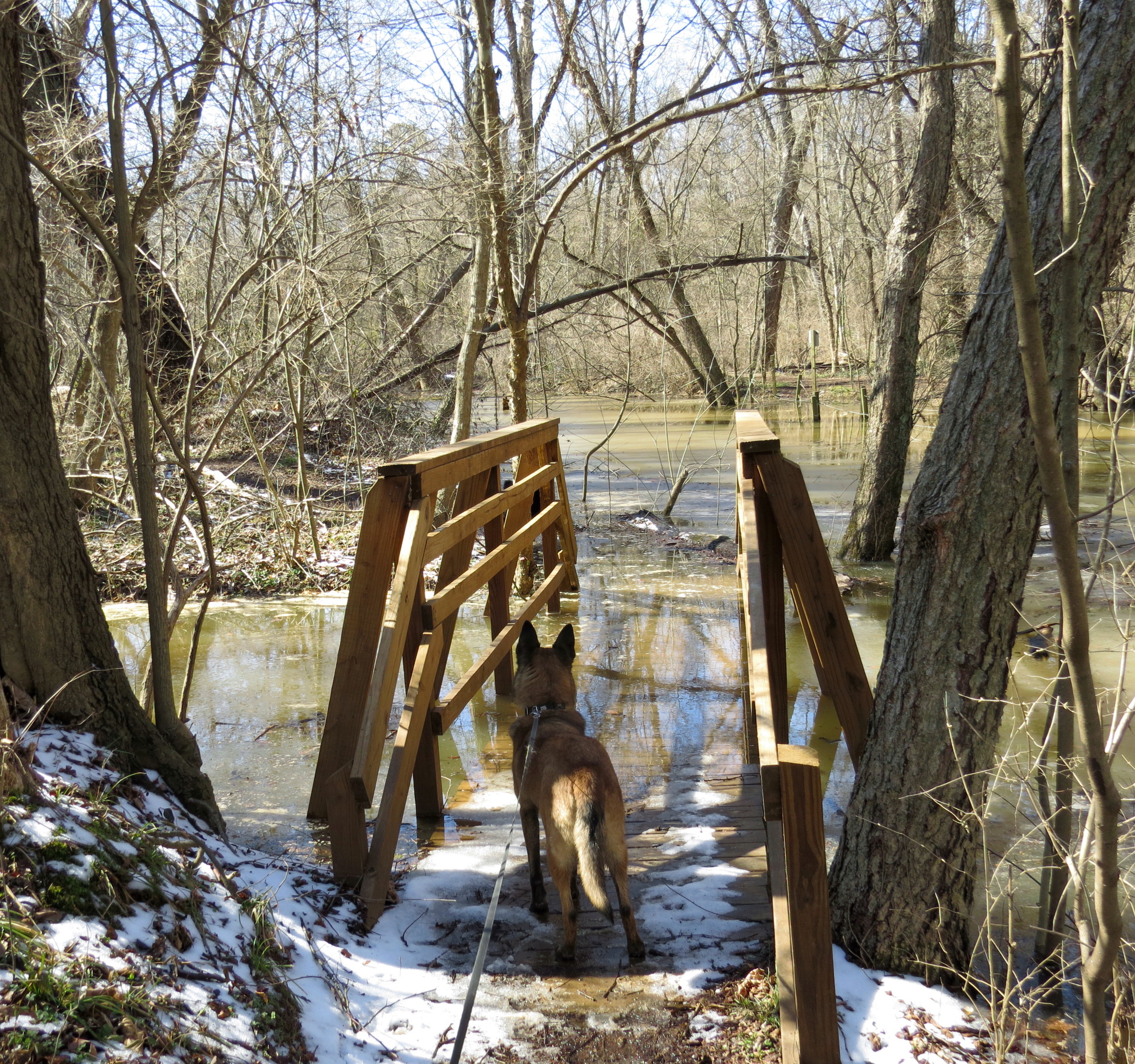 Moderately deep flooding yesterday (the river crested just below 13 feet) pushed a lot of birds and animals into atypical areas. Our hike was somewhat soggy. This is Turner surveying a foot bridge in the back of the park. Mackey had already loped nonchalantly (another awkward word) across; he’s more comfortable with water. That is Turner’s posture of mild trepidation, a sensation he doesn’t often experience. He doesn’t like it when Mackey is out of sight. Unless a squirrel is in sight, and Turner’s focus becomes laser like and nothing else (including Mackey) exists. But here he’s anxious: