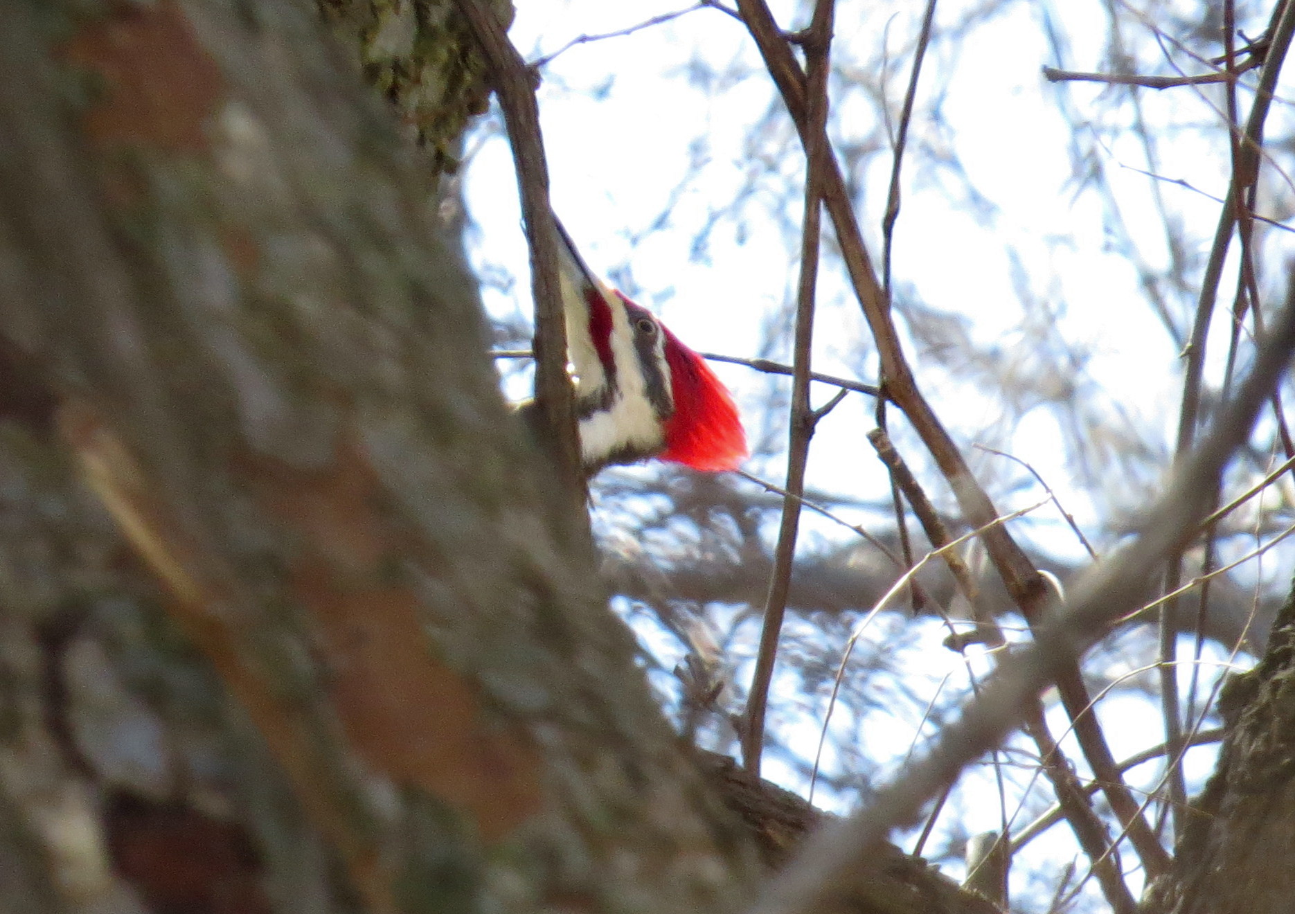 So far in the past thirty-ish days, I have had three opportunities for extended photo “sessions” with wildlife. First with a small herd of whitetail deer, then with that osprey, and a couple of days ago with a mating/nesting pair of Pileated woodpeckers (Dryocopus pileatus). When I say “sessions,” I’m talking about these animals sitting still – one hundred percent aware I’m standing there, with Mackey and Turner, taking lots of photographs – and they don’t leave. I cannot properly express how much I enjoy those experiences. With the deer I got one photograph that was out of this world (My favorite place) plus I’m happy with the osprey pictures. These pileated woodpeckers gave me an eternity and none of the shots are spectacular but they’re not bad. I saw the male pileated first but he was in deep woods and the picture is marginal. Plus the sun was behind him which is terrible for photography. You can tell he’s a male by the red spot in the black line below his eye: