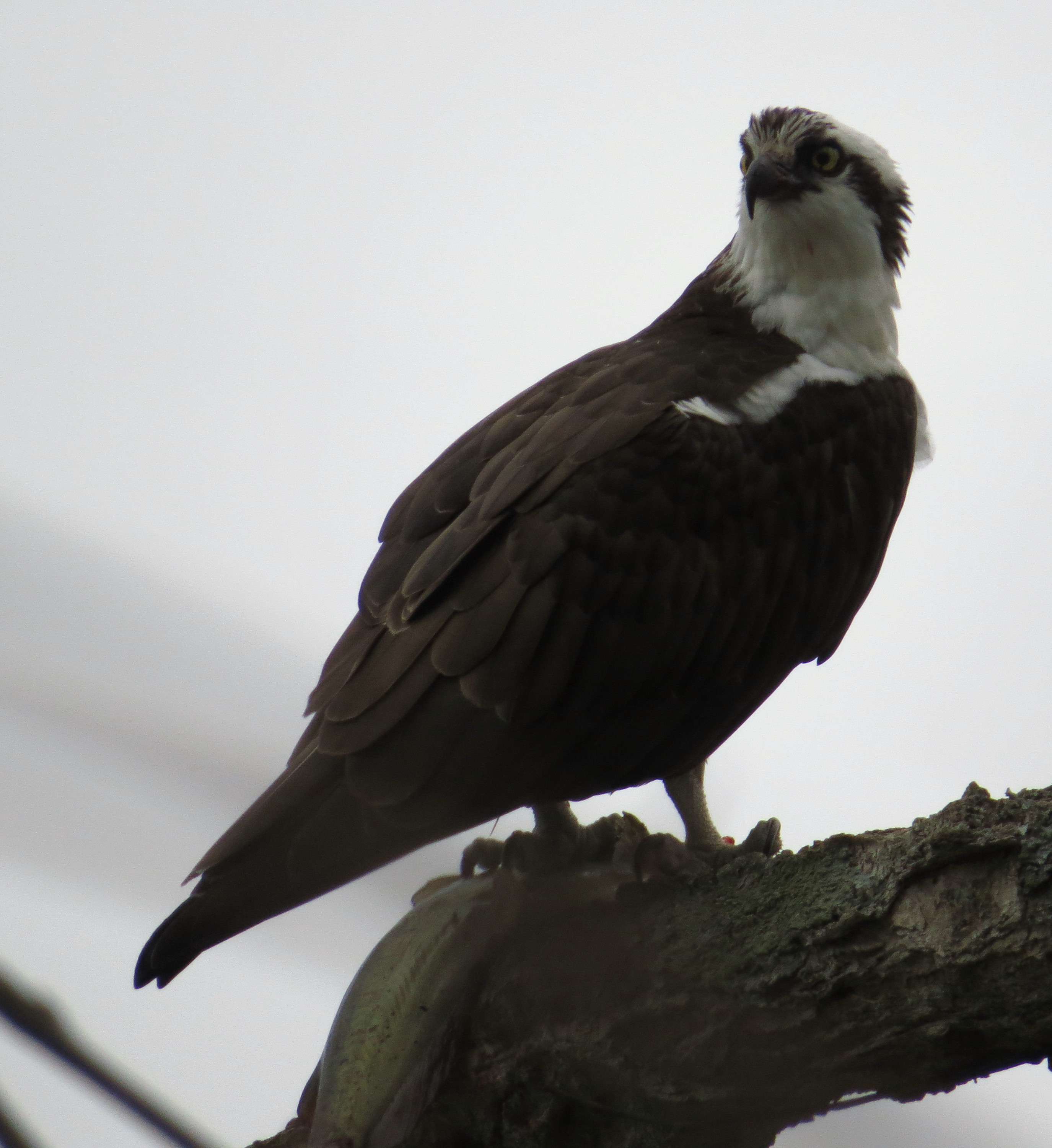 I believe this is a male osprey because the Cornell Lab of Ornithology says “Females usually show dark necklace across white breast.” And this guy has no dark necklace. Here’s another picture. If you look closely on the left you can see the hapless fish’s tail hanging down over the branch. This was not a small fish:
