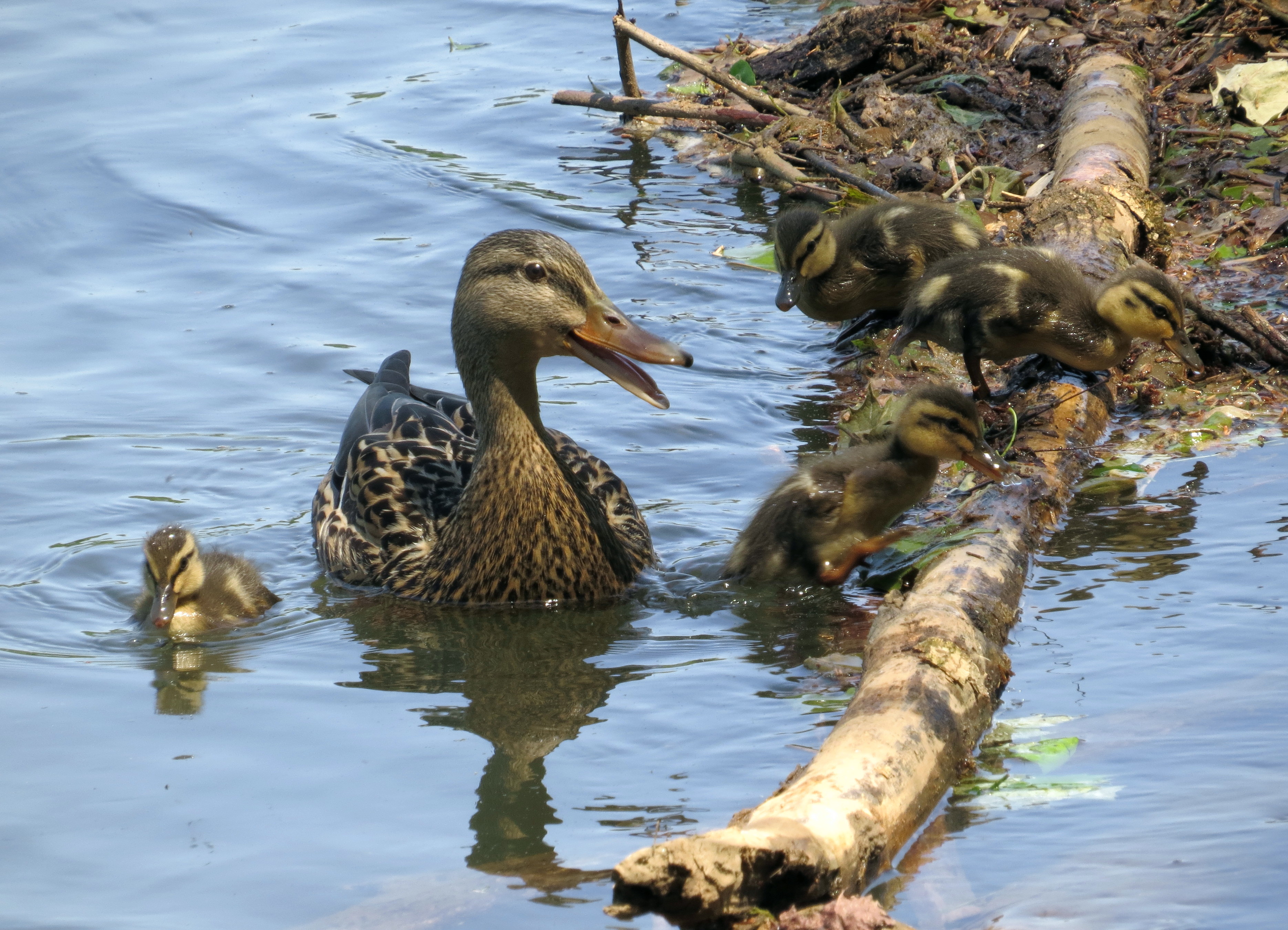 This time of year I am overrun with pictures. I have a terrific shot of a snake with a mud-covered face sticking its tongue out to figure out what’s going on. Maybe I’ll save that for another post. Meanwhile – more babies. Here’s a mother mallard with four babies. One is quietly paddling on her right. She’s “talking” to the three on her left. See how well they are camouflaged?