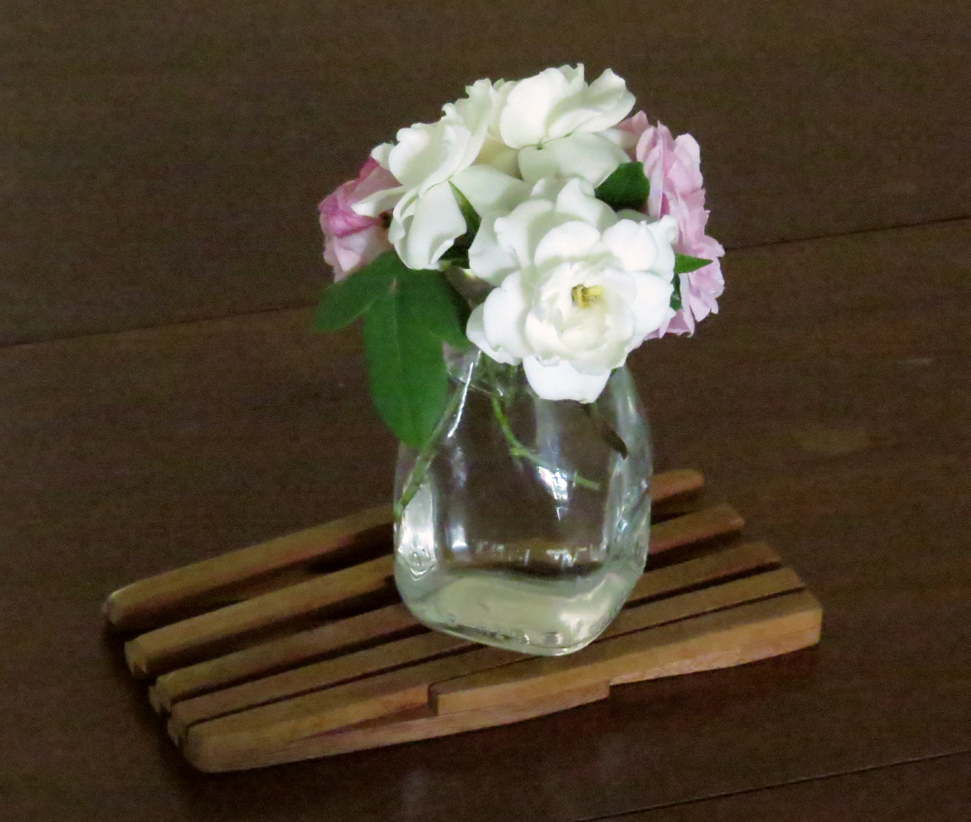Speaking of amazing smelling plants. If I can choose to be indoors or outdoors, I choose outdoors 100% of the time, no matter the weather, no matter the hour of the day. Which is part of my lifelong attraction to honeysuckle. But with domestic plants, when it comes to smelling wonderful, there are gardenias and there’s everything else. The second-best smelling domestic plant (peonies, no doubt) is fantastic. But nothing comes close to gardenias. Evelyn’s got a beauty growing in our formerly semi-barren backyard. She nursed some of our old roses back to health as well. She cut this pink one and some gardenias and put them on the dining room table: