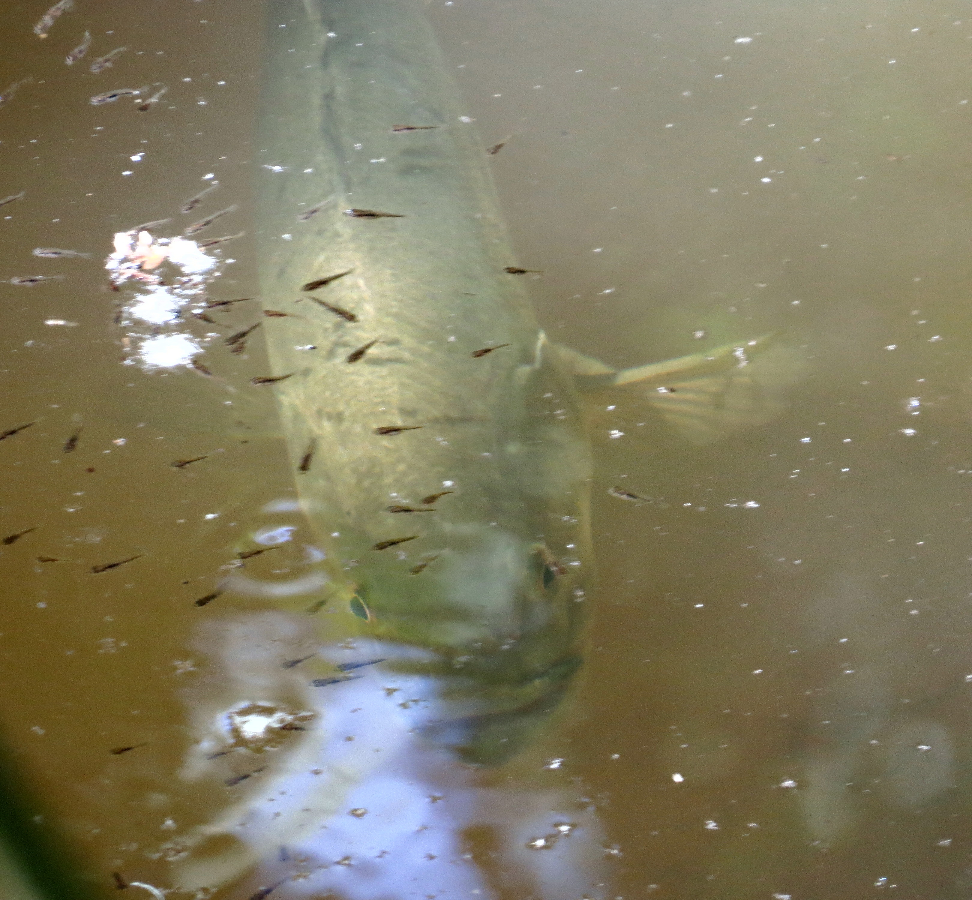 Also, I’ve been obsessed (that’s just how I roll, sometimes) with the pair of hawks this week. I’ve been making my Pony Pasture rounds but my focus has been on those two beautiful raptors. I’ll be back to my Every Living Things project as Spring and Summer progress. Speaking of that, let me add an afterthought picture. I had four dogs with me at Pony Pasture this morning. Try walking four dogs and taking a photograph at the same time. Looking back, I don’t even remember how it happened. But we were on a high bank and I looked down in the water and saw this big (~12″ or 14″) bass eyeing this school of minnows. At breakfast time. In May, everything is eating and being eaten: