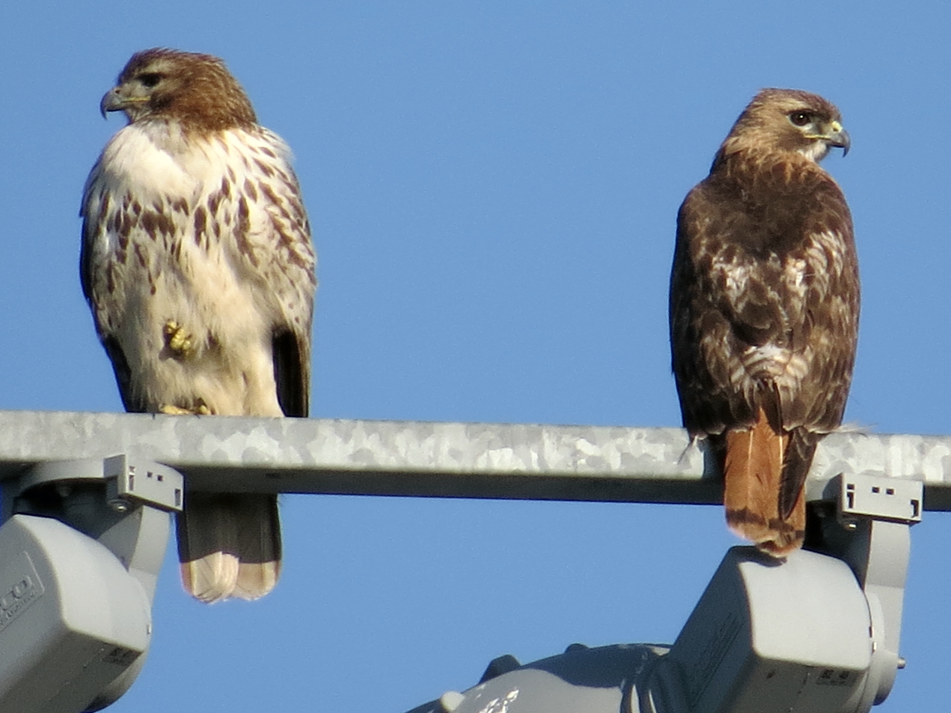 The gender difference in mallards is evident – males have green heads. There is no apparent gender difference in Canada Geese. The gender difference in Red-tailed hawks is their size. Females are significantly larger. In that picture, the female is on the left. When I see a single Red-tail, it’s difficult for me to tell if it’s a male or a female.