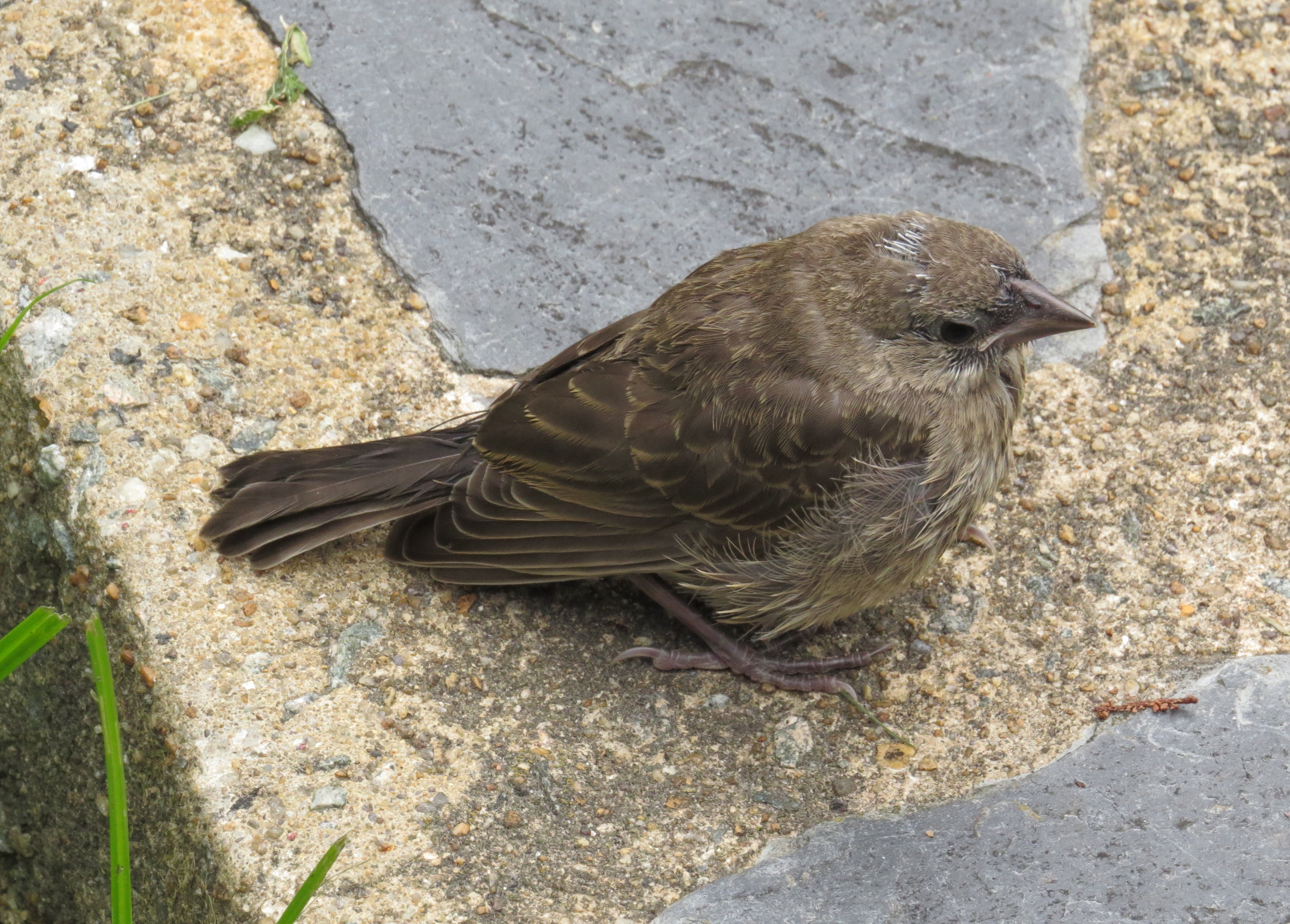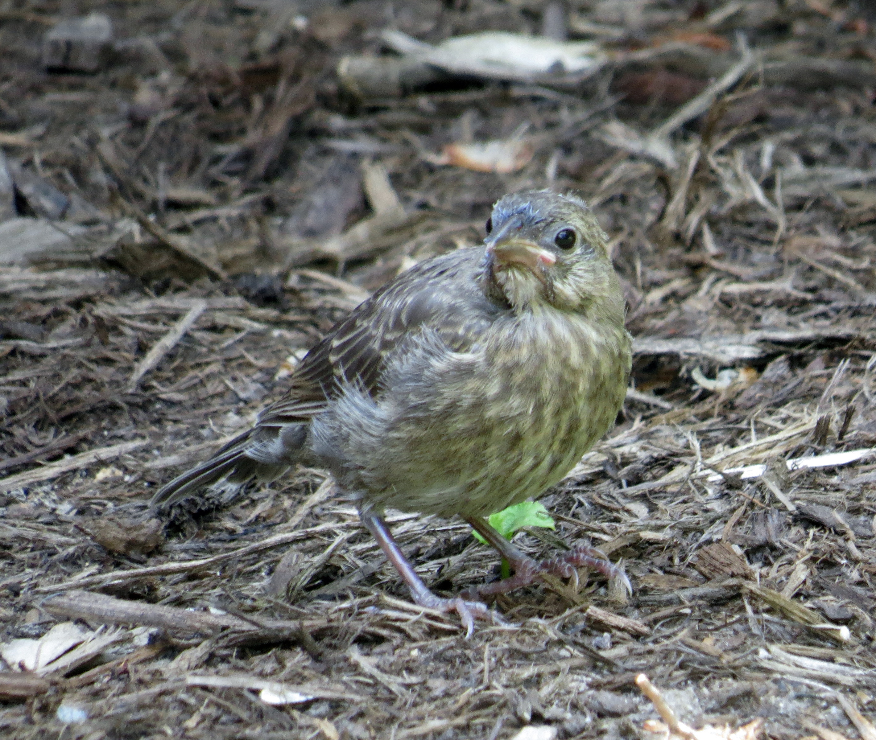 We’ve had two little birds fledge in the yard this week. I think they’re both sparrows of some sort. Or finches. One was on the mulch in front of the house while i was cutting the grass: