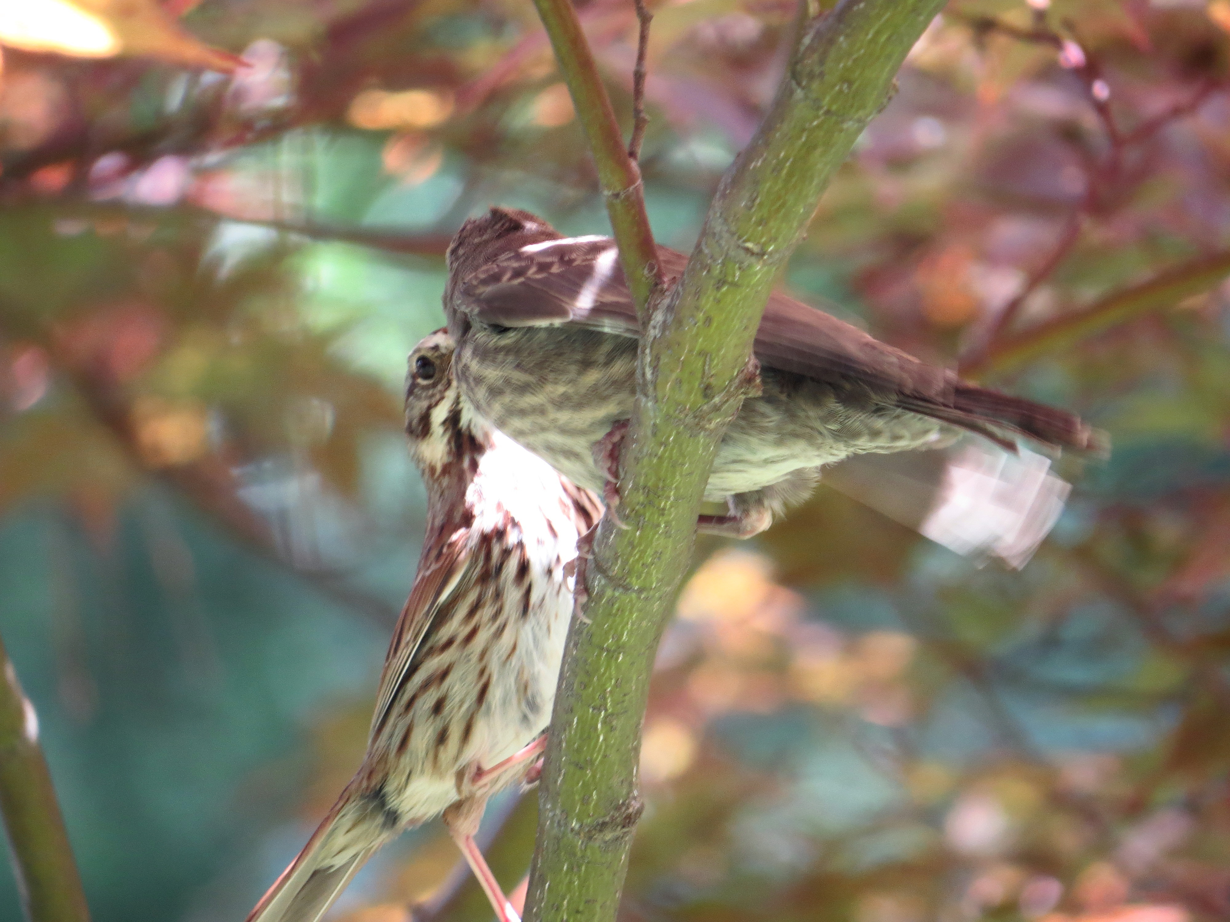 After a few minutes it gathered up its strength and flew past my ear and landed in the red maple in our front yard. A moment later an adult bird flew over for a visit. Another poor picture but nice – both later flew away looking energetic and healthy: