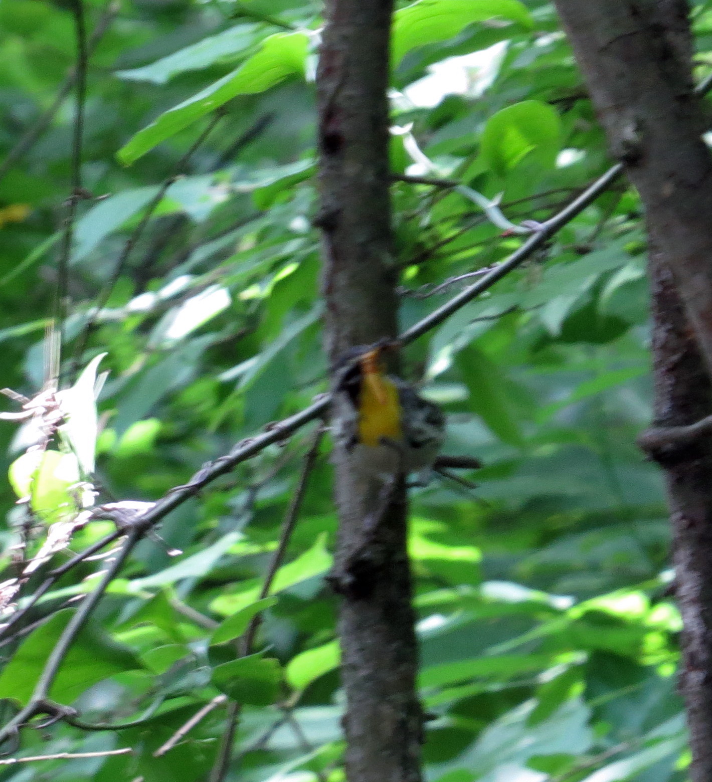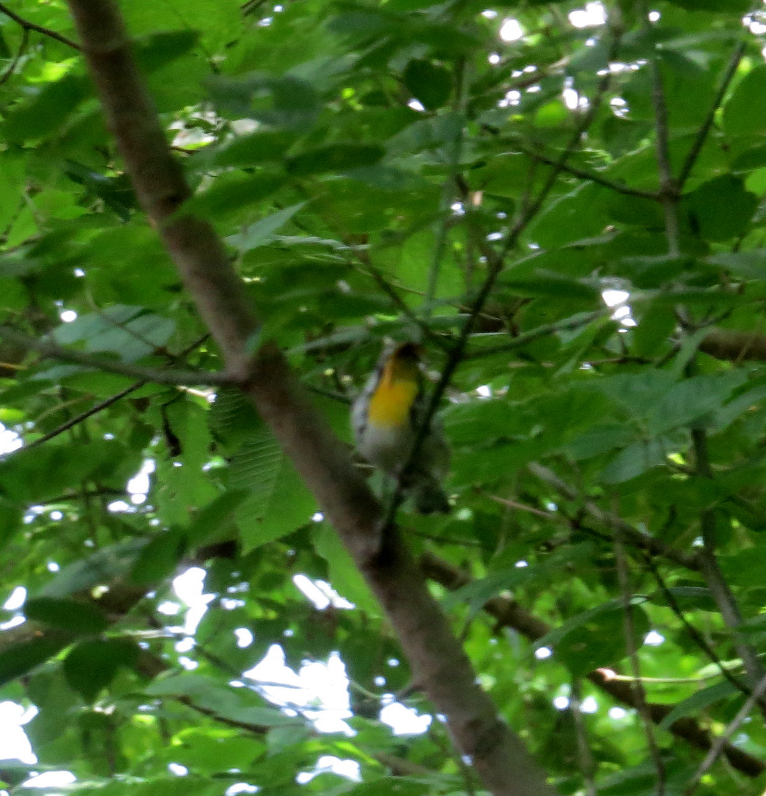 [[As of Monday morning, June 8, 2015 I’ve had two blog watchers (my friend Kim & one other) guess the above bird is a Yellow-throated warbler (Setophaga dominica). Click on that link and see if you agree; it appears to be correct. I’ll work on getting a better picture. And thank you for your assistance! And have a great day!]]