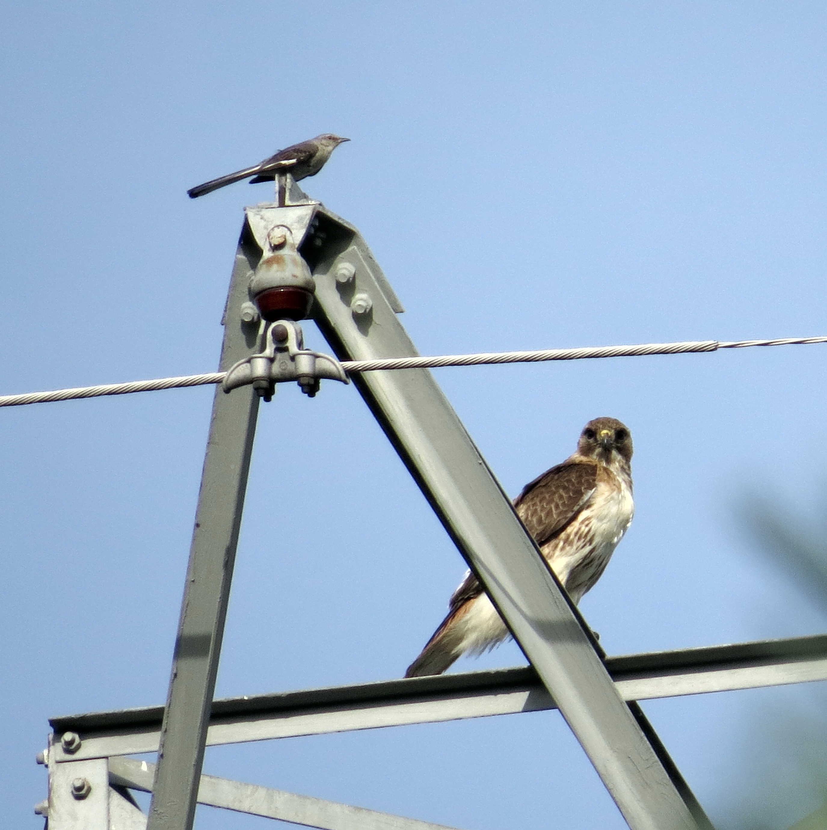 …if you don’t like pictures of hawks. Or – more likely – if you don’t like pictures of snakes. I don’t know how long these Red-tails will be hanging around my neighborhood, but as long as they do, I’m going to post a picture a week. I am, as you have perhaps noticed, fascinated. This is a pose I don’t often see. A mockingbird and a hawk both on the powerline tower, just standing there: