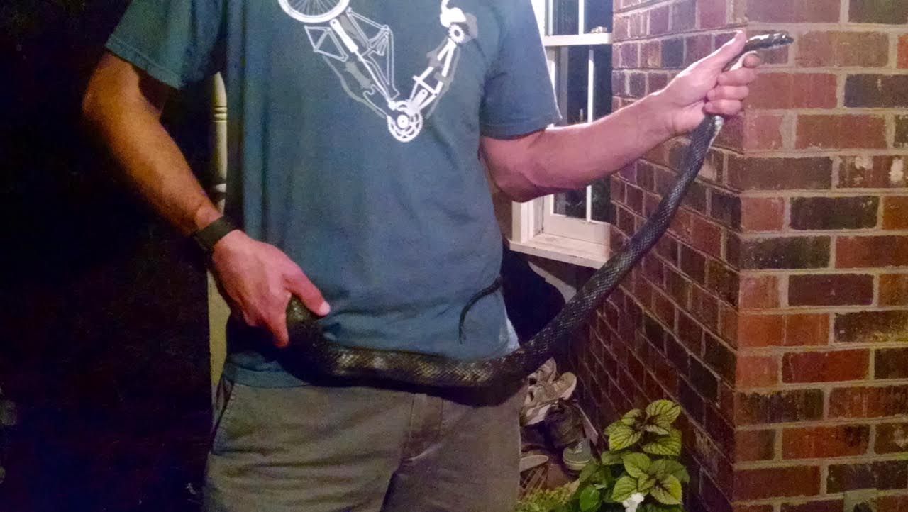 OK – snake pictures coming up. Time to bail if you’re an ophidiophobe. Or go to anxiety coach dot com and put your ophidiophobia behind you for good and all and come back. This snake visited my brother’s house in Hanover. It’s an Eastern Ratsnake (Pantherophis alleghaniensis). He moved it to a more upscale neighborhood: