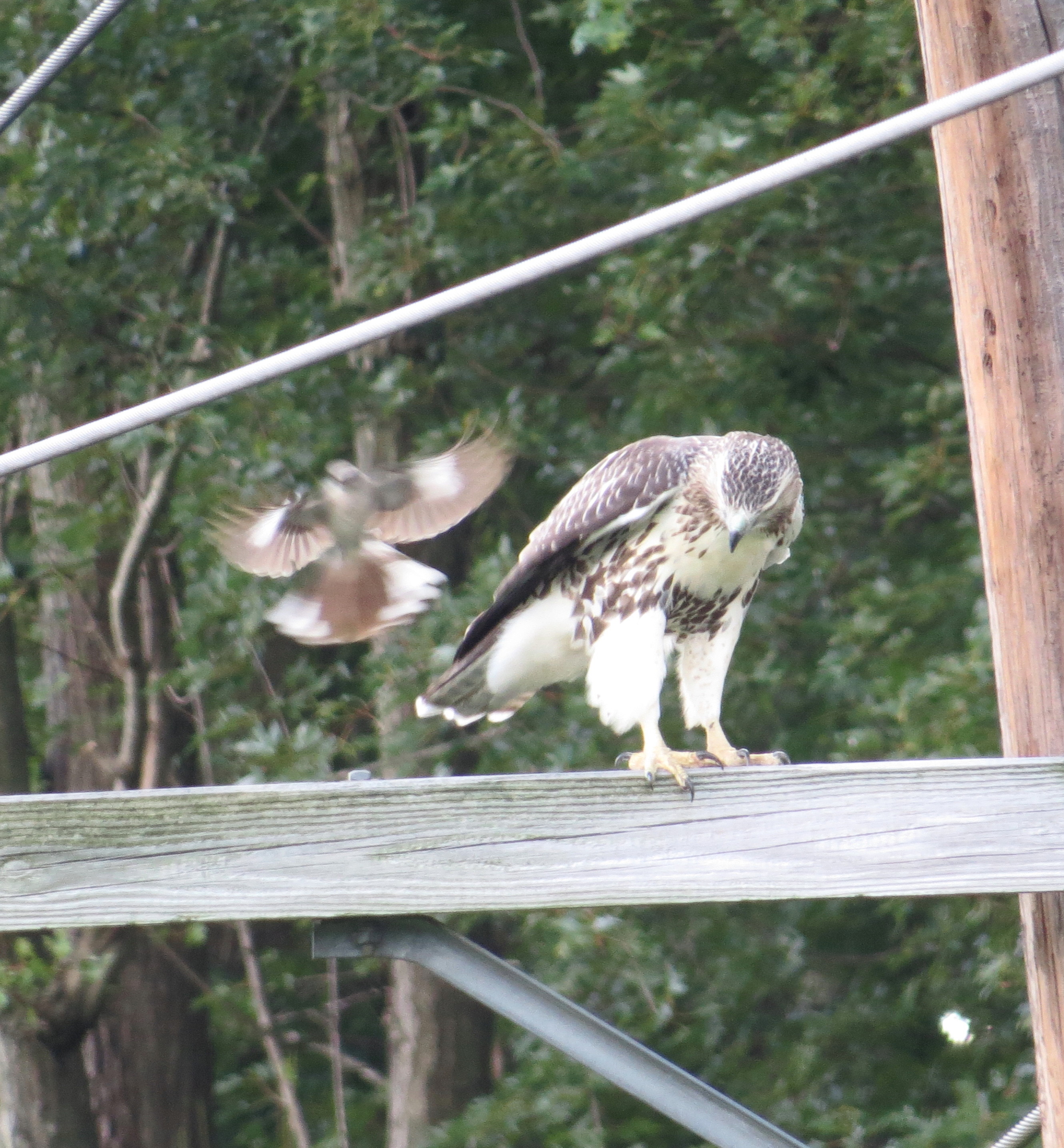 Then he got driven off by a mockingbird – it never ends – and hopped up onto a nearby power line. The mockingbird’s coming after him again: