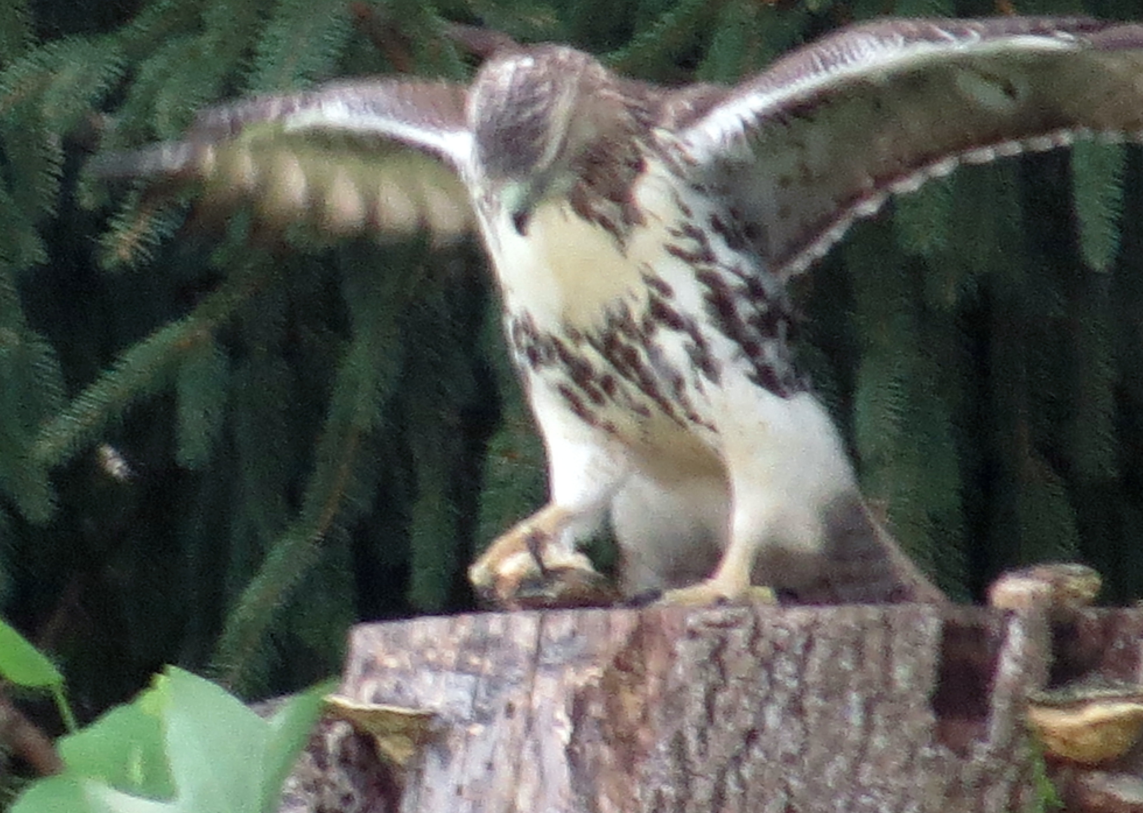 I have learned a bit about where to find them though. My first Red-tailed hawk photo was on May 1 of this year, but I have Barred owls and ospreys and turkey vultures from April. So I’ve been photographing them steadily for five months. June 28 of this year I put up a post called “Warning: graphic images – hawk catches a rabbit.” The pictures from that post were so remarkable and it’s so close to my house that I look up at that stump every time I drive by. I was rewarded again yesterday afternoon when I swung past it on my way home. Same stump, different bird, different “quarry”: