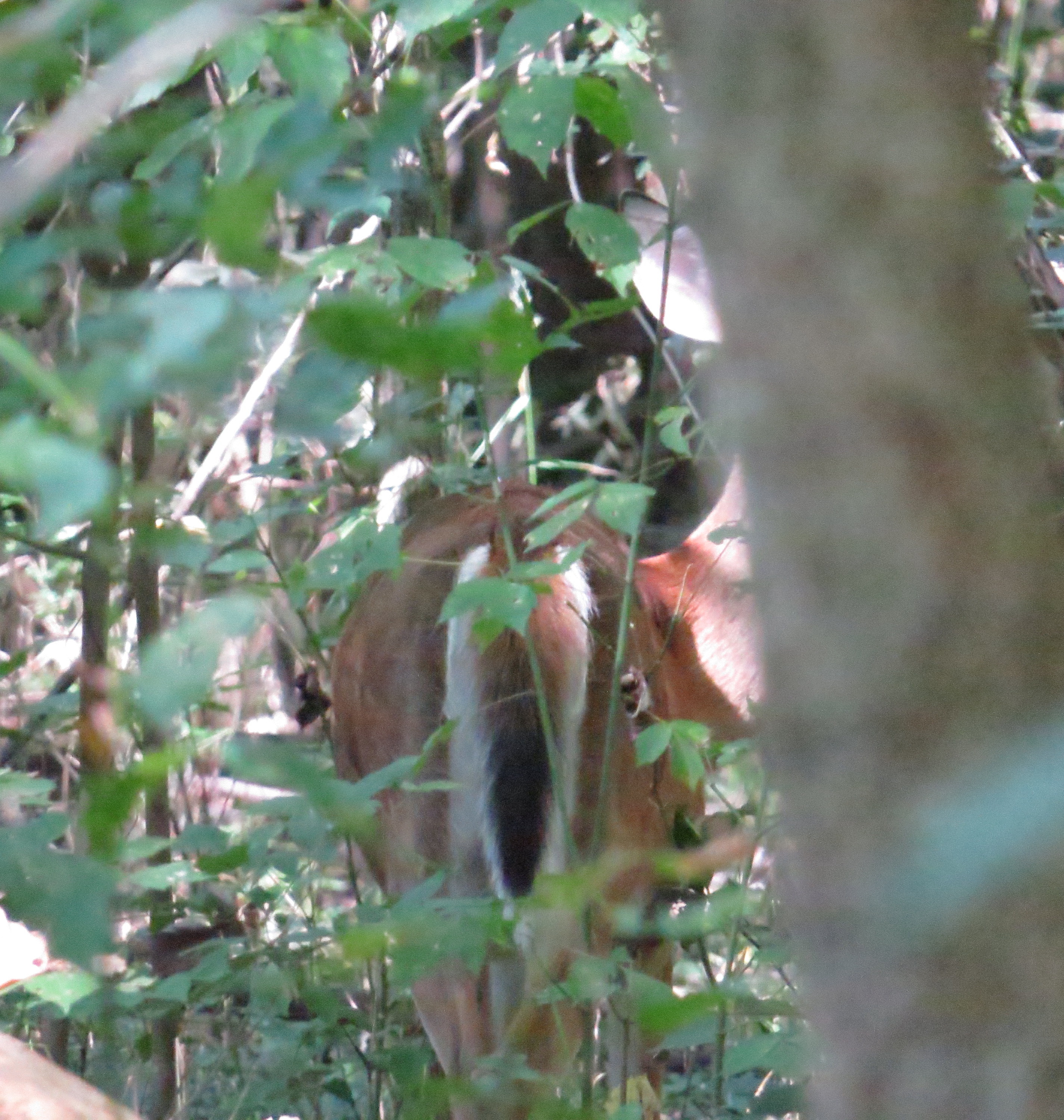 Deer blending into woods; see his tail, and see his ear sticking out just behind the tree trunk? Up high?