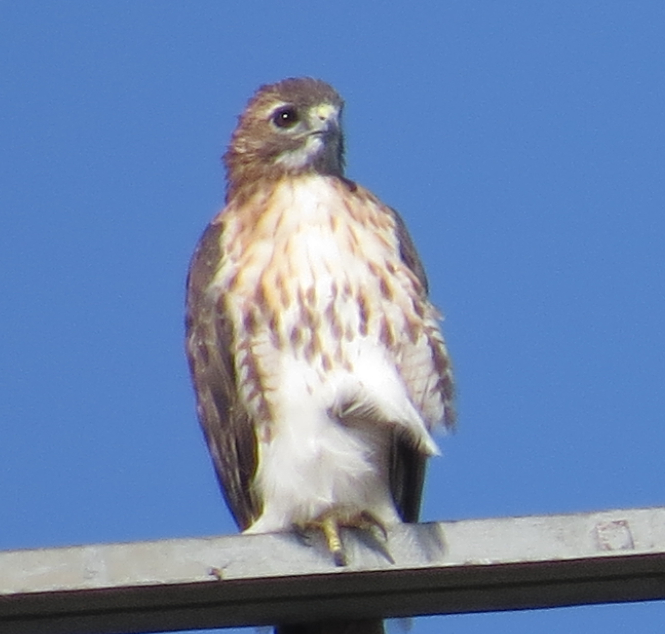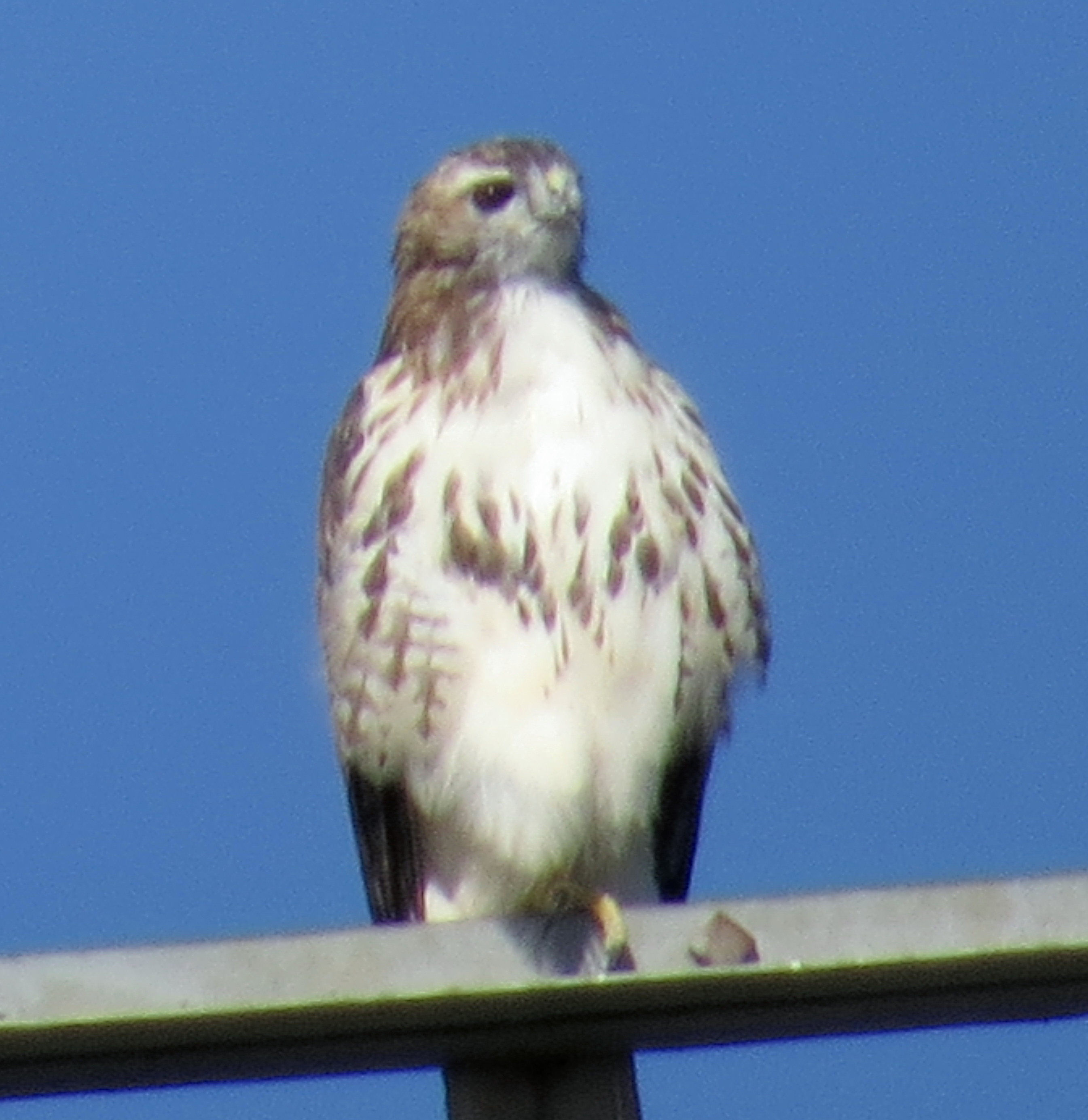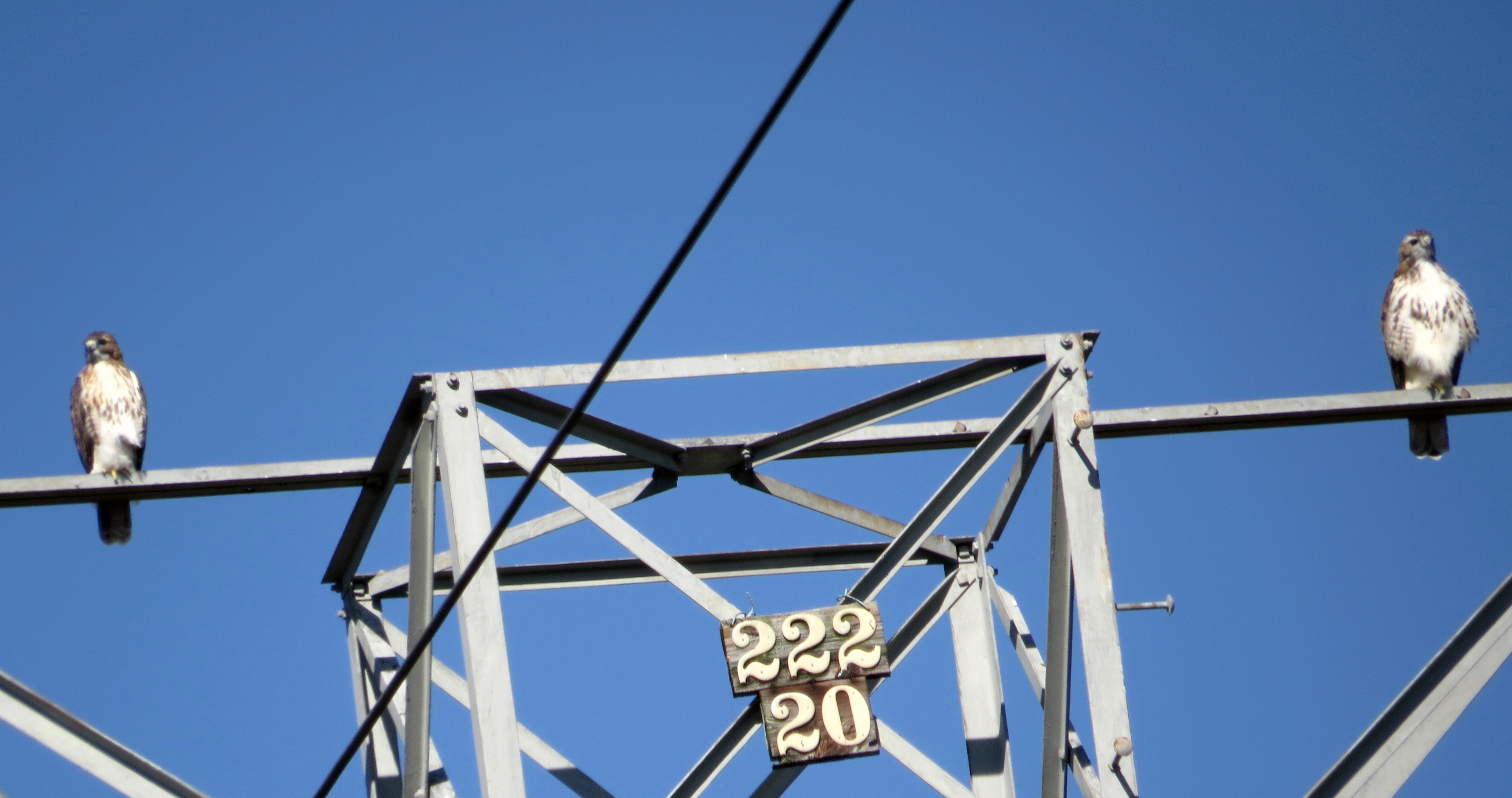 A hundred-thirty-six whole words and nary a mention of a hawk; you must have known that wouldn’t continue. I’m learning about them at a great rate this year, and my interest is only becoming deeper. This week I photographed two at the same time on the power line tower near Freeman HS. It may have been a pair, but if I were a gambling man I’d bet that the one on the right is an adult female and the one on the left is a juvenile. Here’s a picture of two at one time: