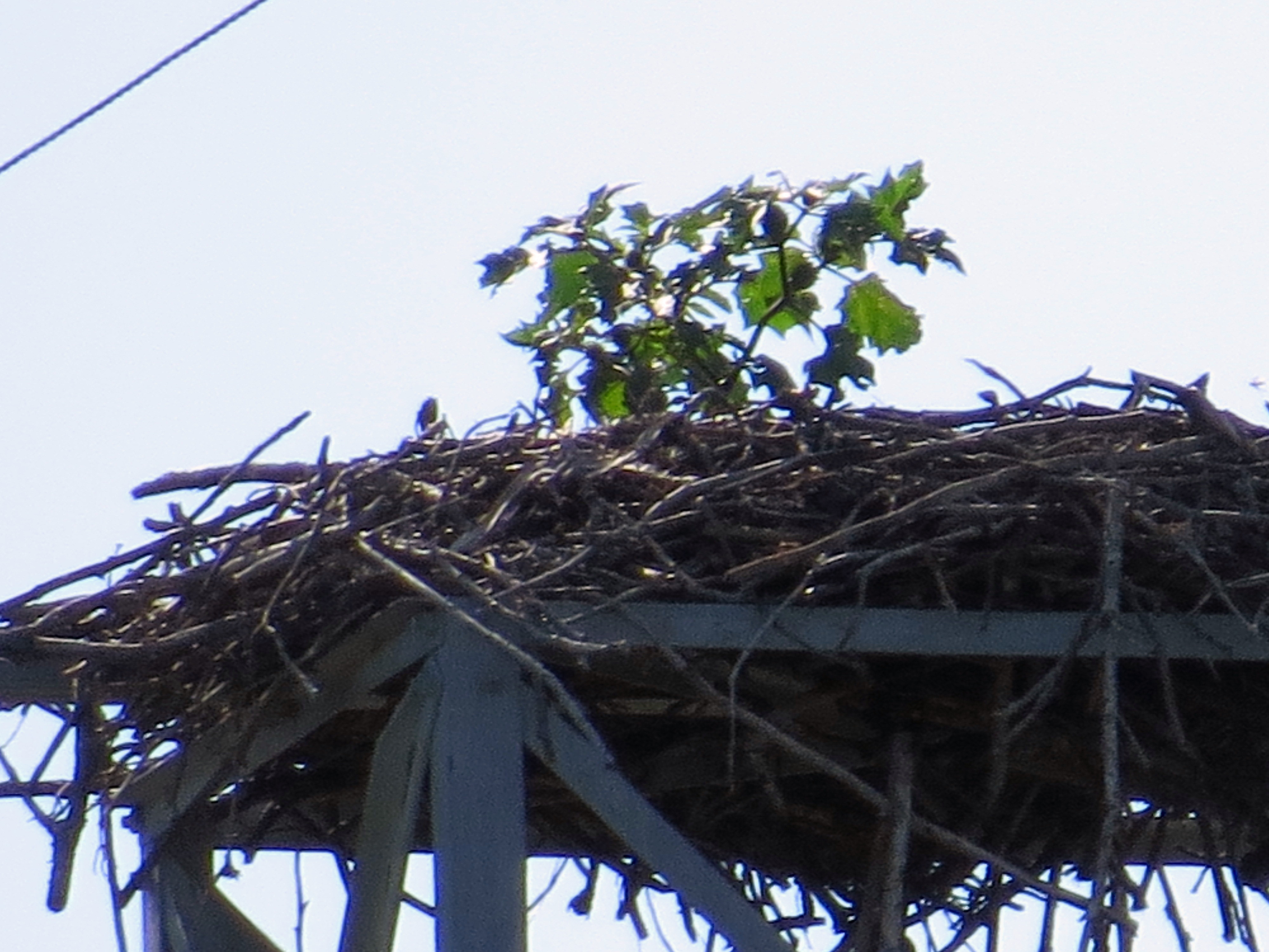 Speaking of learning about ospreys, I know where there are a few nests and I glance up at them when I’m in the area. I saw something in a nest this week. I was surprised because I thought the ospreys had left. Most ospreys from the east coast of North America overwinter in Venezuela. So I parked in one of my favorite osprey watching hideouts and zoomed in on the nest to find this: