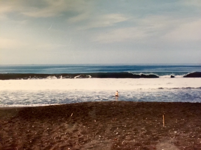 Black waves on a black sand beach at the edge of a black-sand town. All volcanic ash.