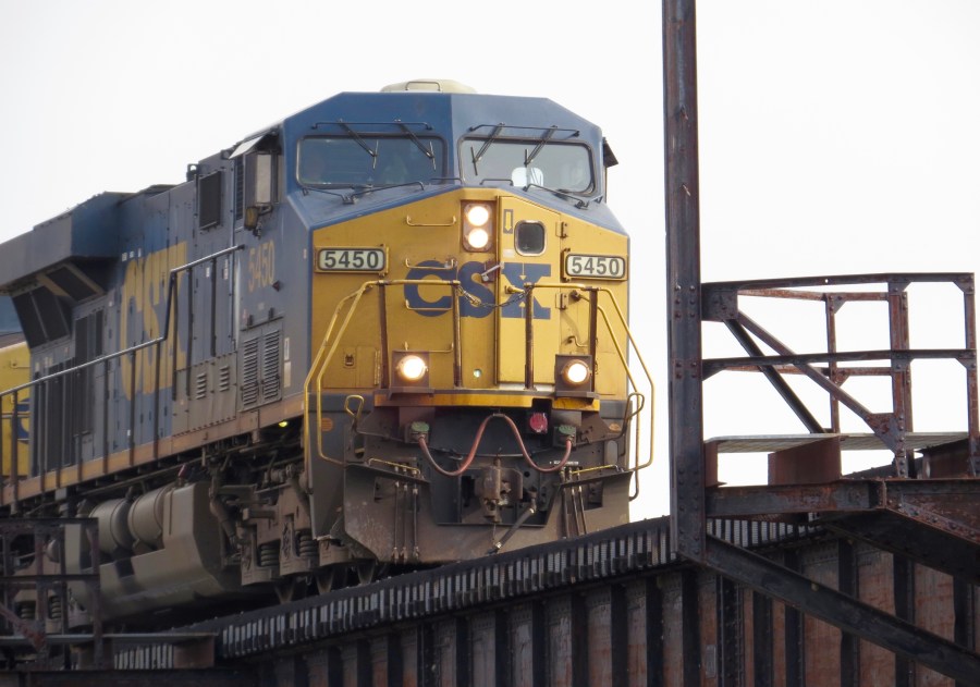 GE locomotive pulls a rare westbound train past the Federal Reserve and Brown’s Island