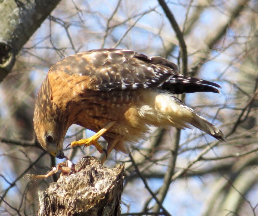 Red-shouldered Hawk eating a frog on the banks of the mighty James River