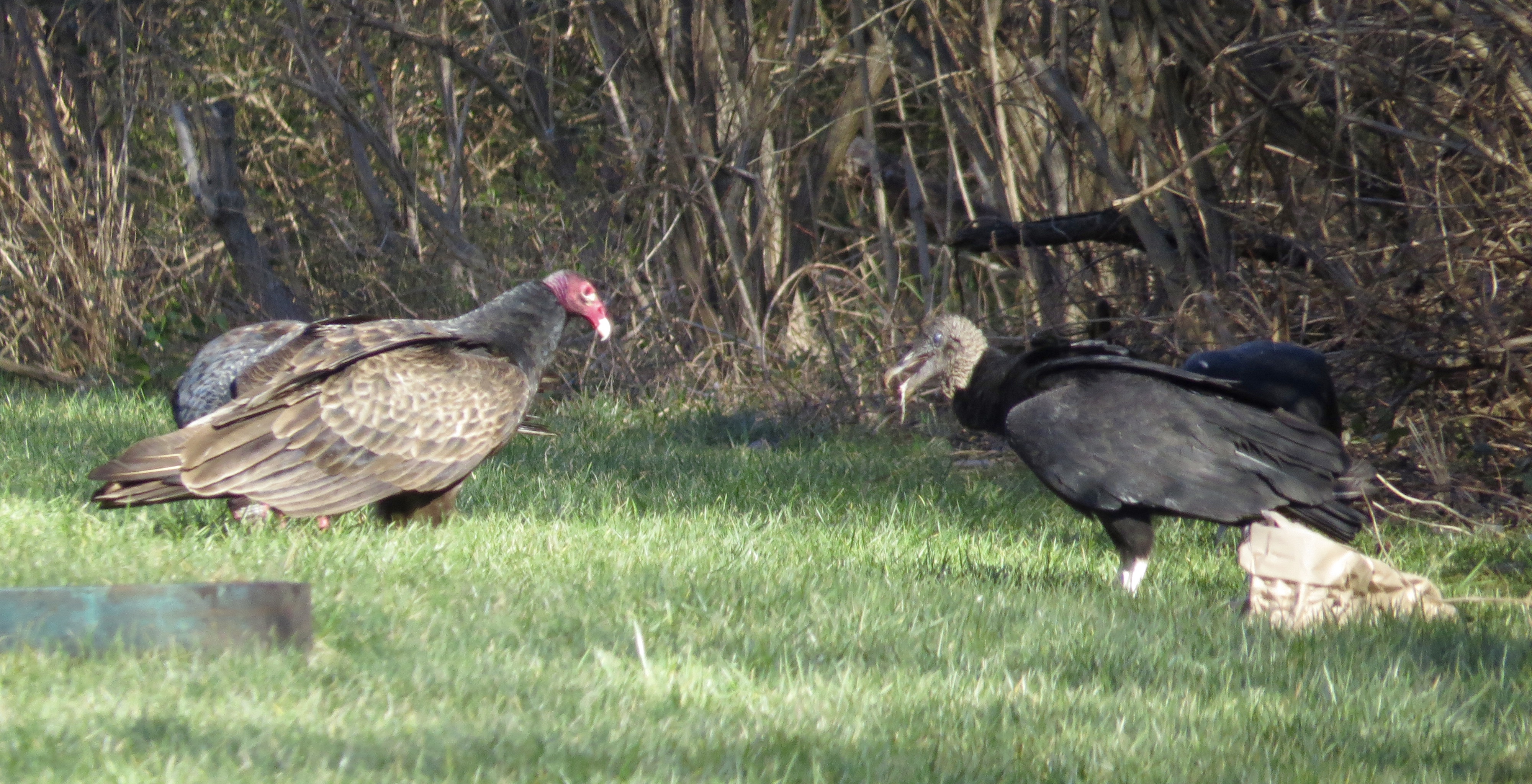 Turkey vulture and a Black vulture face off over a fish carcass.