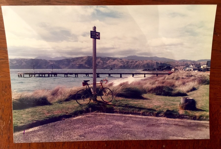 My road bike leaning against a post near the swim section. I get cold just looking at it.