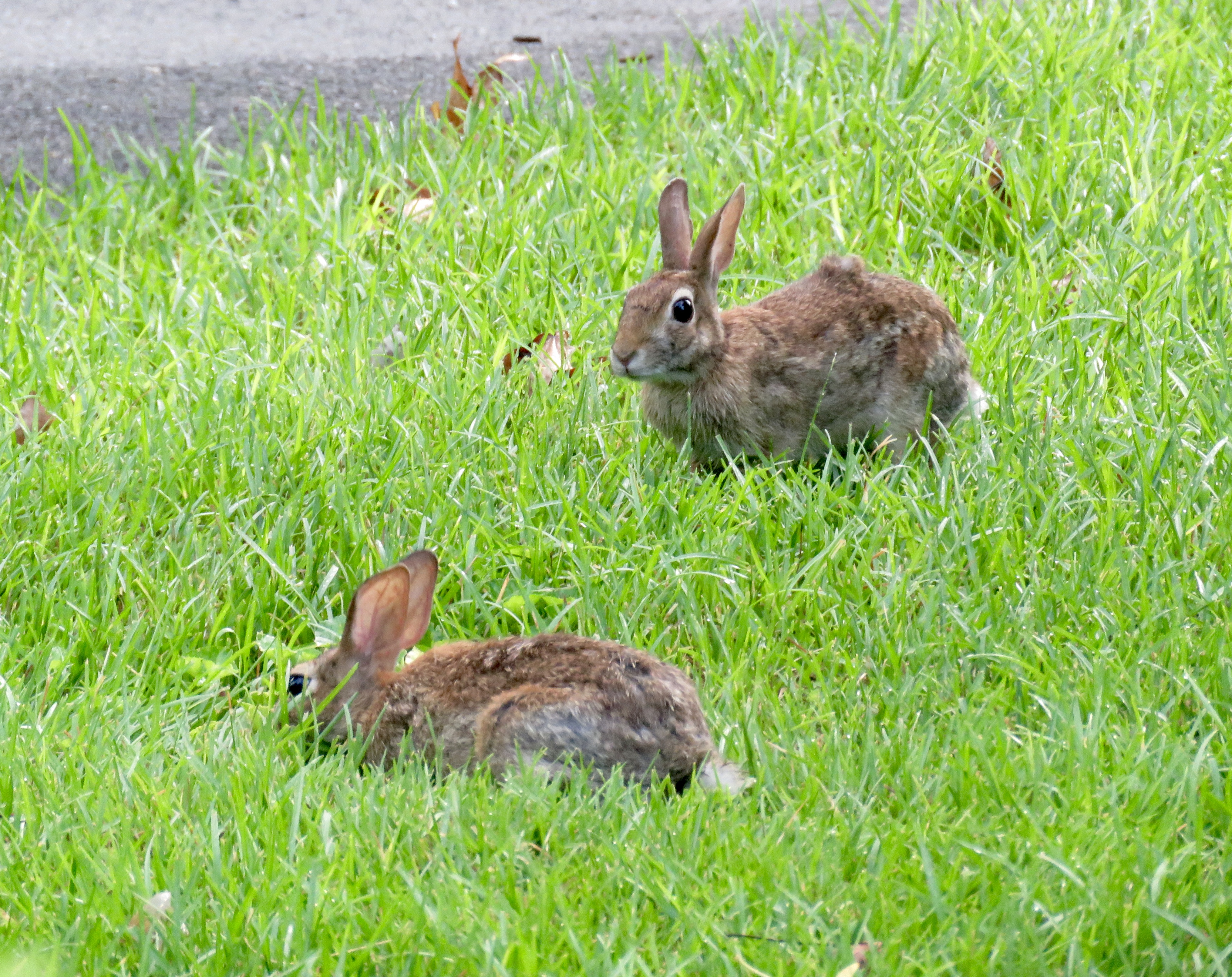 Young cottontail rabbits munching on the fresh grass in the morning