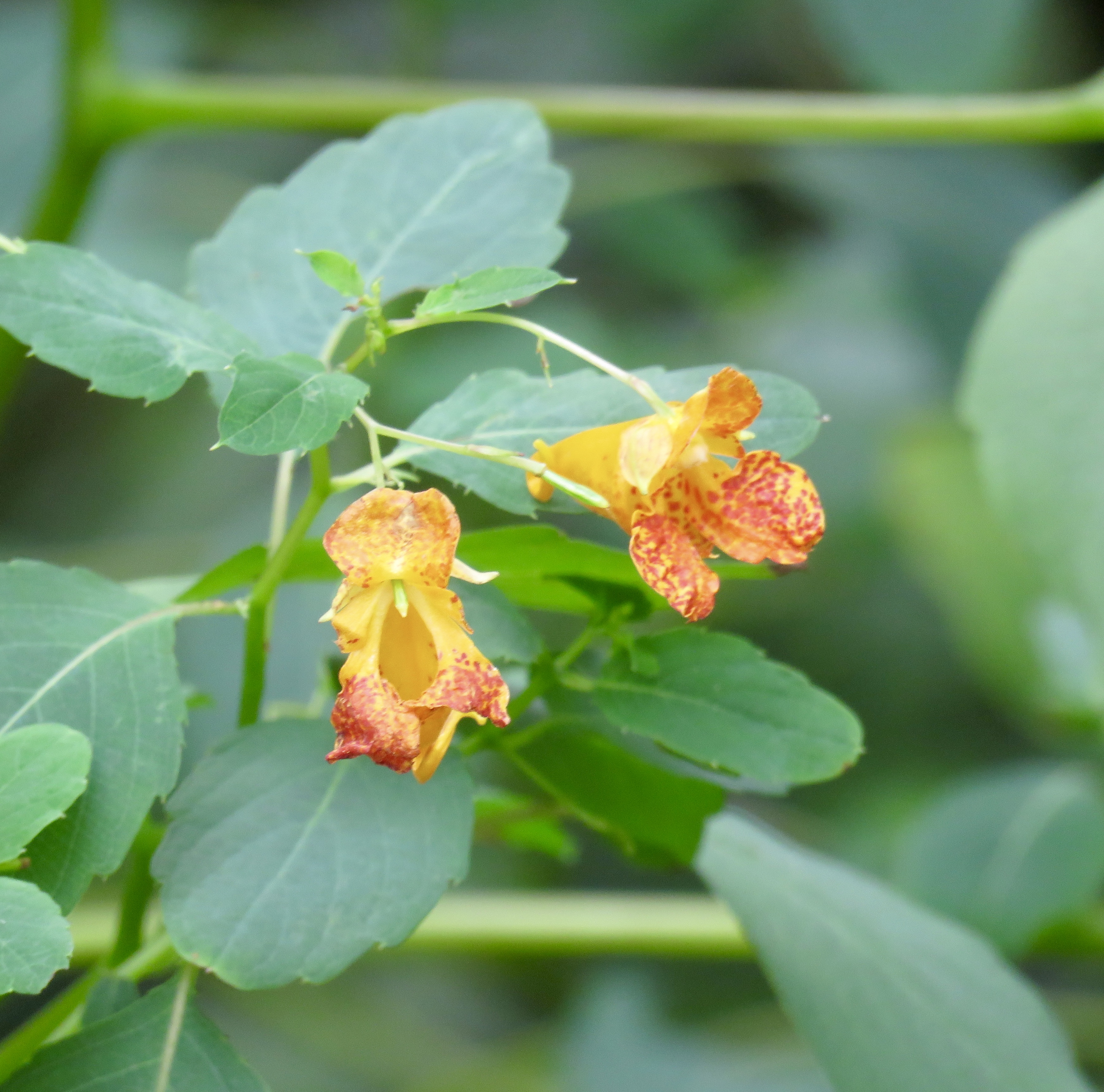 The glow of an orange jewelweed contrasts warmly with the new purple flower