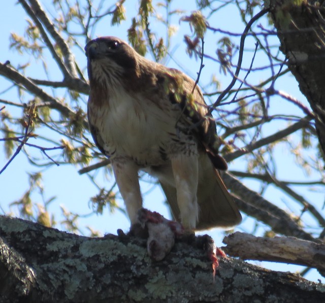 Red-tail makes it to the safety of a tree with its freshly killed squirrel. 9:32
