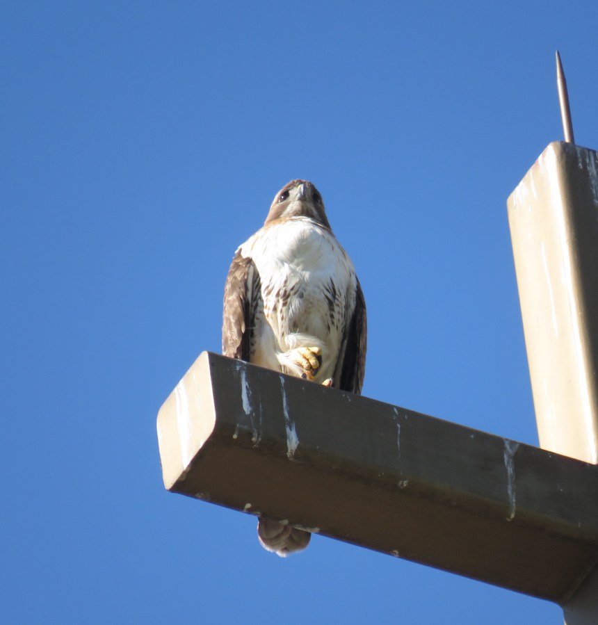 Hawk back up on the cross – this time with a crop (stomach) full of fresh squirrel