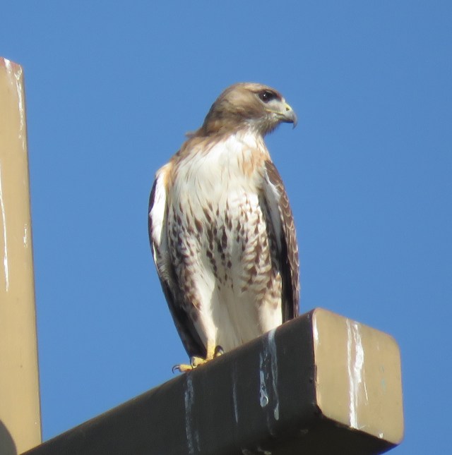 The birds have been noisy – I misspoke. And the flowers are bright. Also perhaps you recall two weeks ago I put up a post called Accident anniversary / Singular encounter(s) / and more. It showed a Red-tailed hawk (Buteo jamaicensis) flying off a church cross, killing and eating a gray squirrel, then flying back to the cross – thirty-three minutes, cross to cross. That happened on April 5. Twelve days later – on April 17 – I drove past the same church again (Discovery United Methodist Church) and there was another (or the same, or possibly its mate) Red-tail on the cross. Here’s the picture I took on the 17th: