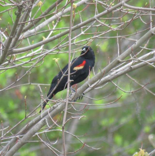 Friday at the Tuckahoe YMCA I got a male Red-winged blackbird, obscured a bit by branches: