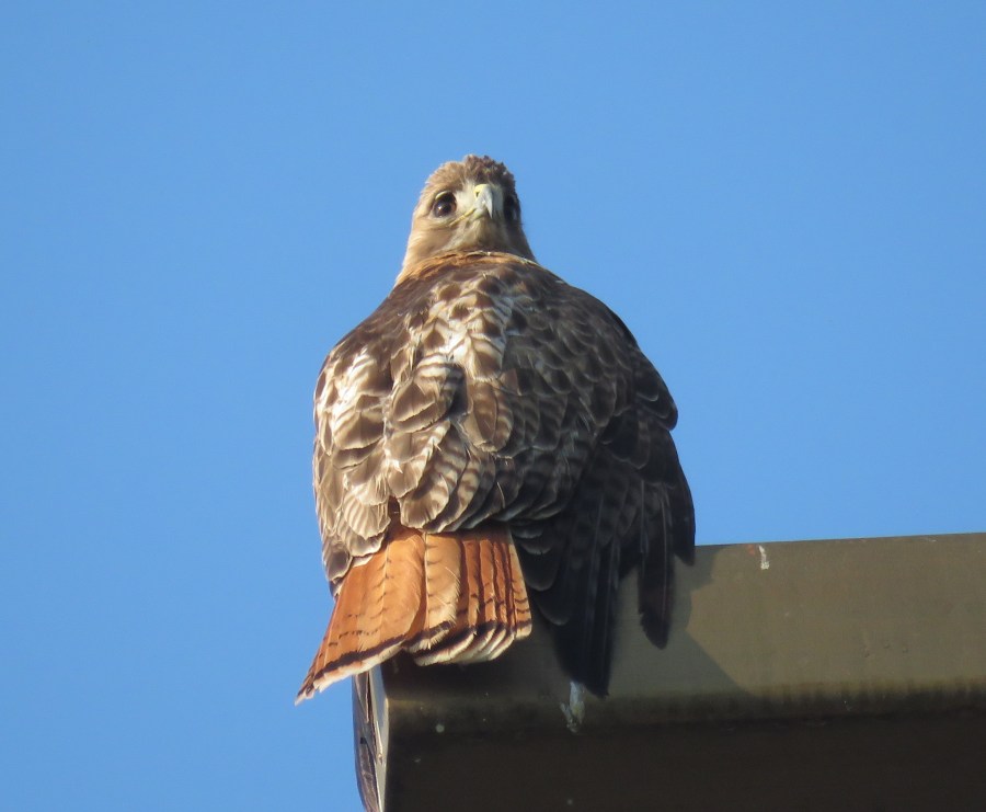 Red-tail tail feathers drying in the early morning sun