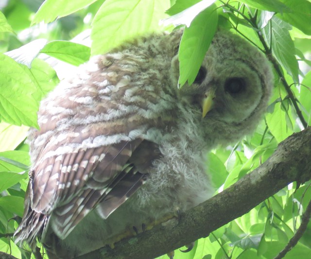 I was hiking with the dogs Saturday morning when a woman named Pam pointed out a  baby Barred Owl on one side of the trail: