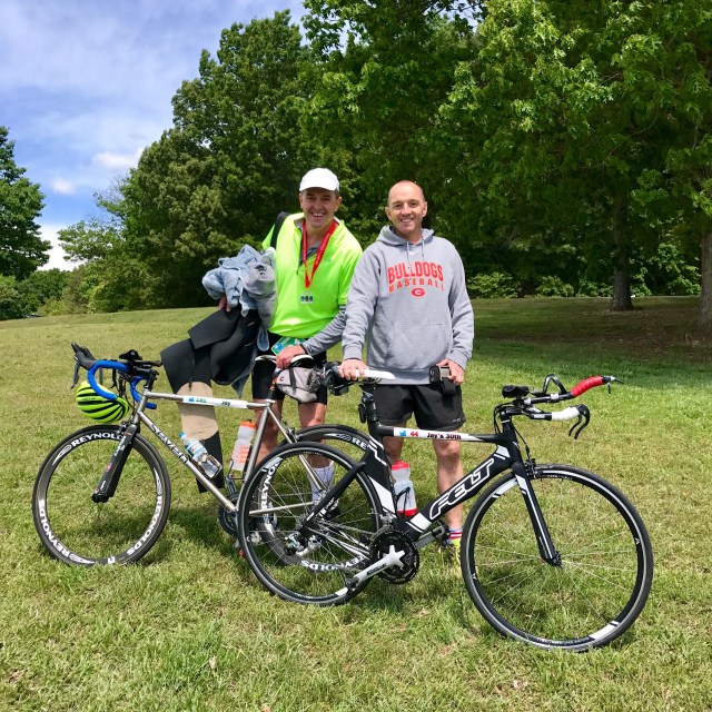 My friend Andrew drove with me to Lake Anna State Park this morning where we tied for first place in the 2017 Peasantman Triathlon. True excerpt from their web site: “As previously mentioned, We allow people to mix distances (i.e., sprint swim, oly bike, oly run or any such combo), cheat, and pull a Rosie Ruiz on the run, so don’t expect any age group awards. The people finishing in front of you, probably cheated.” They don’t give real awards, they just have a podium at the end and you can stand on it as you see fit. Since Andrew and I crossed the finish line side-by-side in first place, here we are standing side-by-side on the first place spot on the podium: