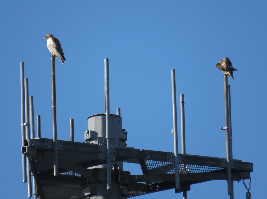 Redtail pair on tower. Always look in high places if you want to see Red-tails.