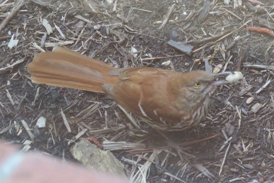 Brown Thrasher holding a prize