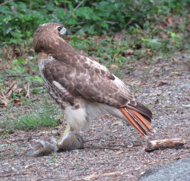 It’s not impossible that Red-tail killed that squirrel. But this time of year it’s equally or more likely the squirrel got hit by a car and the Red-tail grabbed a quick free meal. There are lots of young squirrels around and they get hit by cars all the time right now.