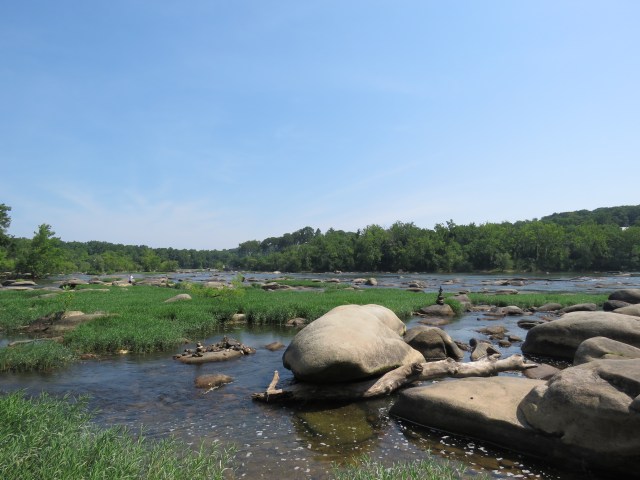 The trails we hike in Pony Pasture have an unmistakable northern border – it’s the water in the river. There is also a well-defined eastern limit, the fourth hole of the golf course at the Willow Oaks Country Club. So the northeast corner of the park is a little spit of sand where a creek flows into the river. We always take a break there since that’s the last place for the dogs to drink and swim for a while. And it’s hot out! I took this picture from that sandbar at 9:50 this morning: