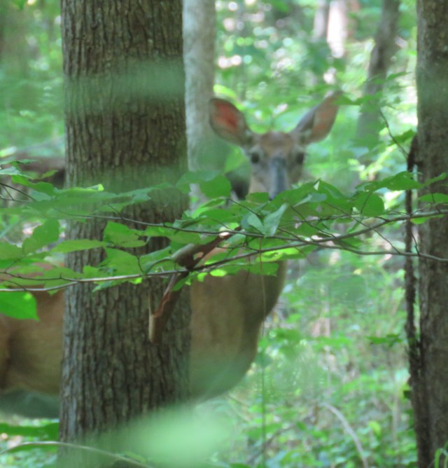 Mackey and Turner and I hiked by ourselves late Thursday morning. We saw a lone jittery doe crossing the trail through the pine woods just west of the pasture itself. This isn’t one of my usual spots and I don’t think this deer is used to me. The deer in the woods south of Charlie’s Bridge are so used to us they barely move when we’re around. This deer was on high alert and the photograph is weak: