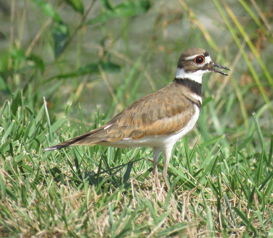 Adult Killdeer calling to daring youngsters: